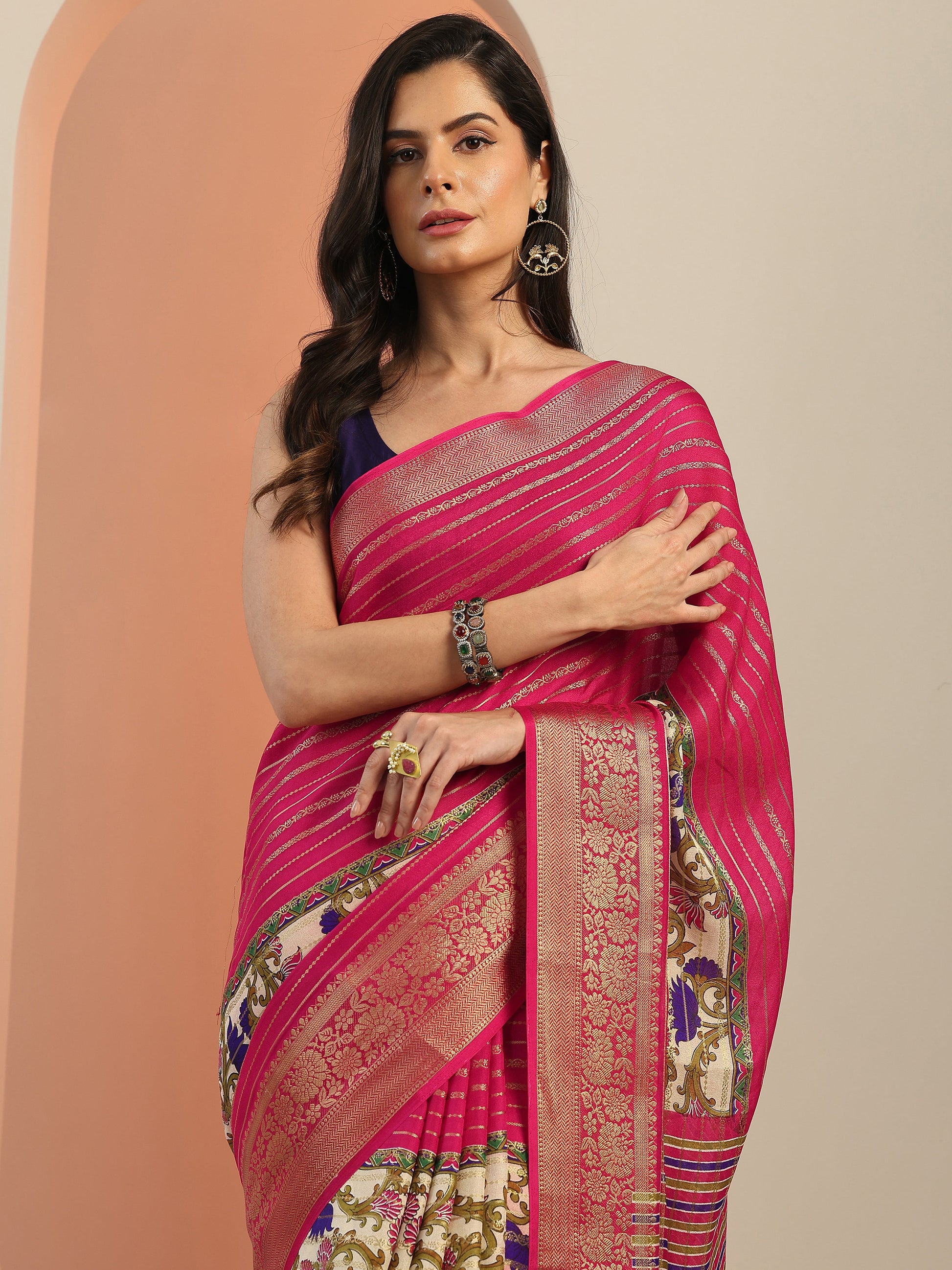 Our Multi Printed Silk Blend Saree Features Captivating Woven Design. Complemented With A Unstitched Blouse Piece. This Charming Saree Is Perfect For Festive Wear.