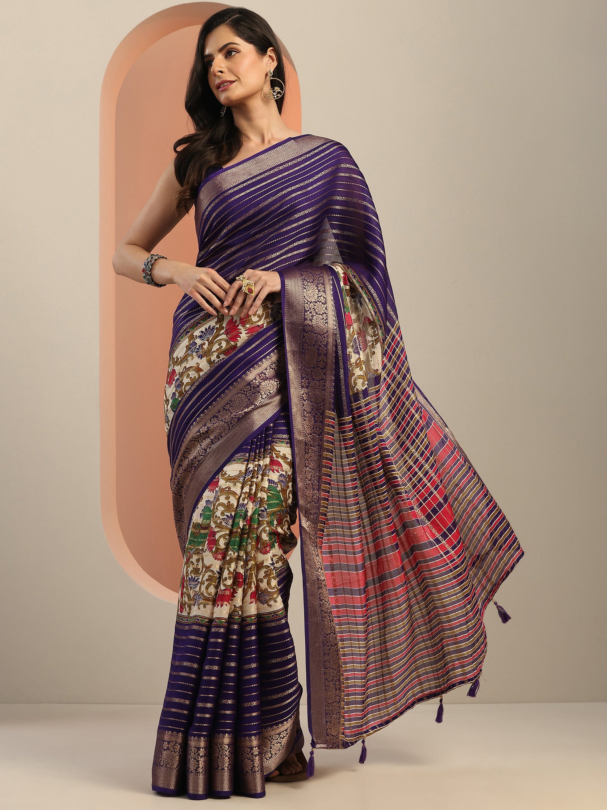 Our Purple Printed Silk Blend Saree Features Captivating Woven Design. Complemented With A Unstitched Blouse Piece. This Charming Saree Is Perfect For Festive Wear.
