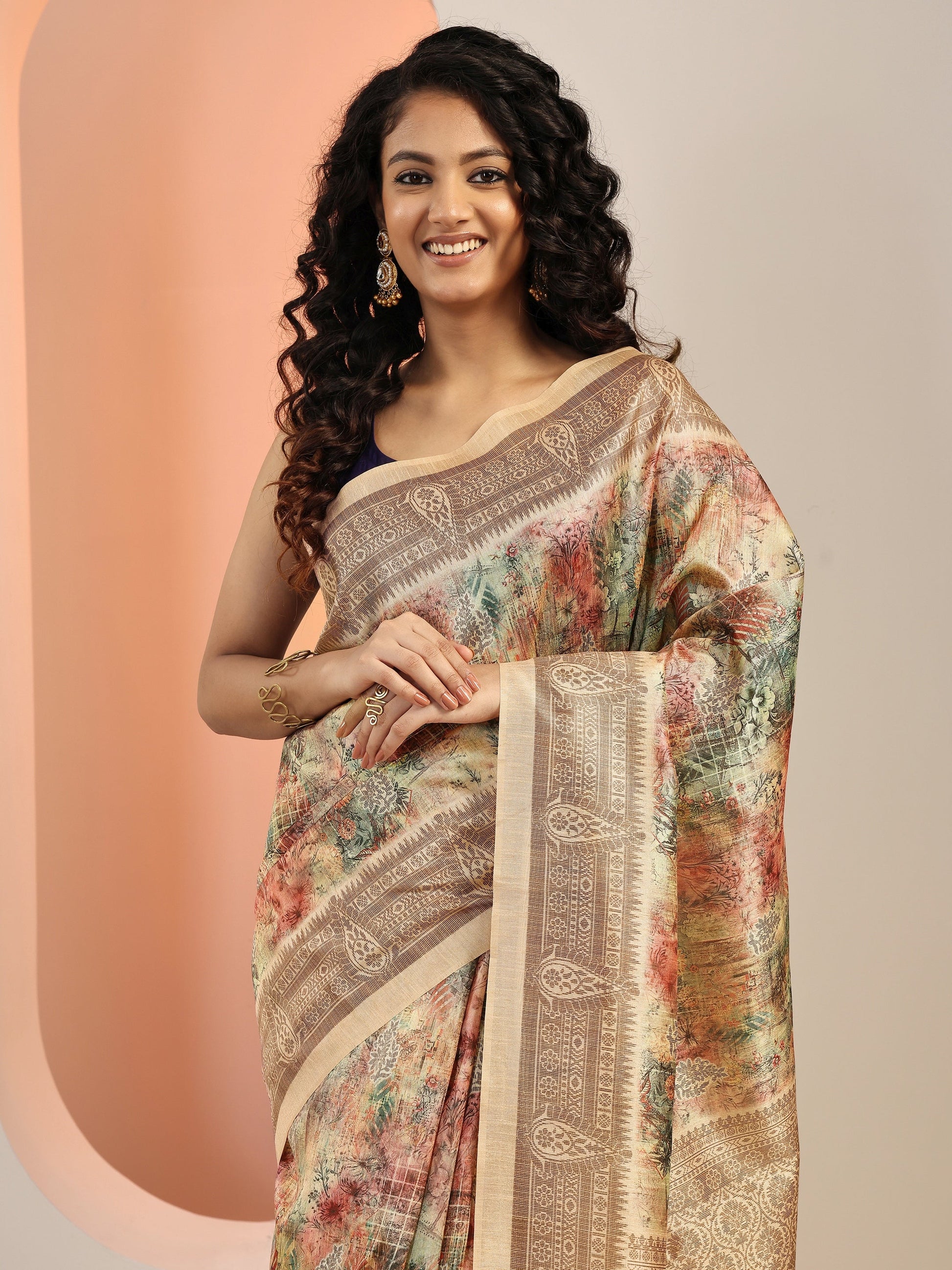 Our Beige Printed Silk Blend Saree Features Captivating Ethnic Motif Printed Design. Complemented With An Unstitched Blouse Piece. This Charming Saree Is Perfect For Festive Wear