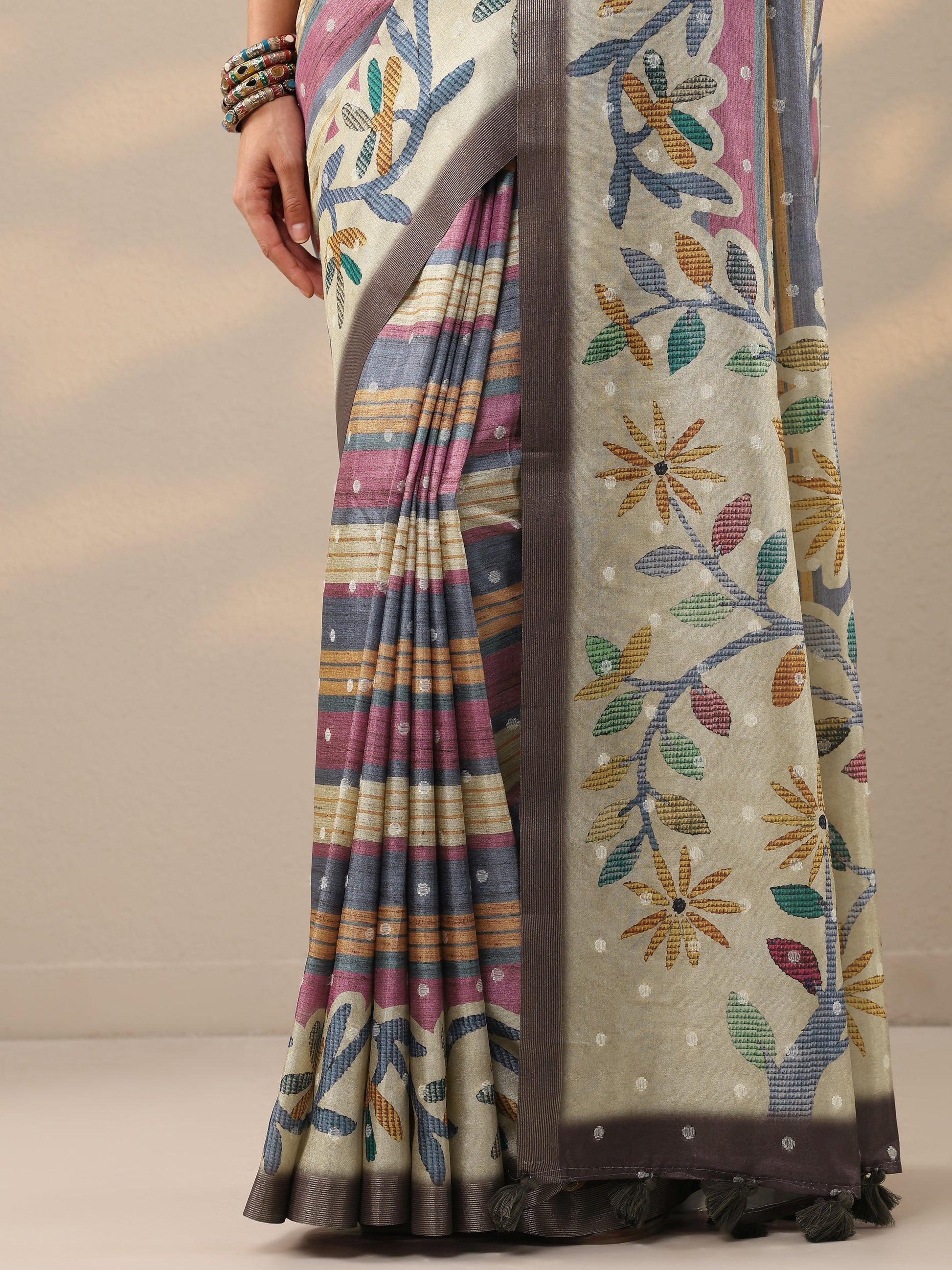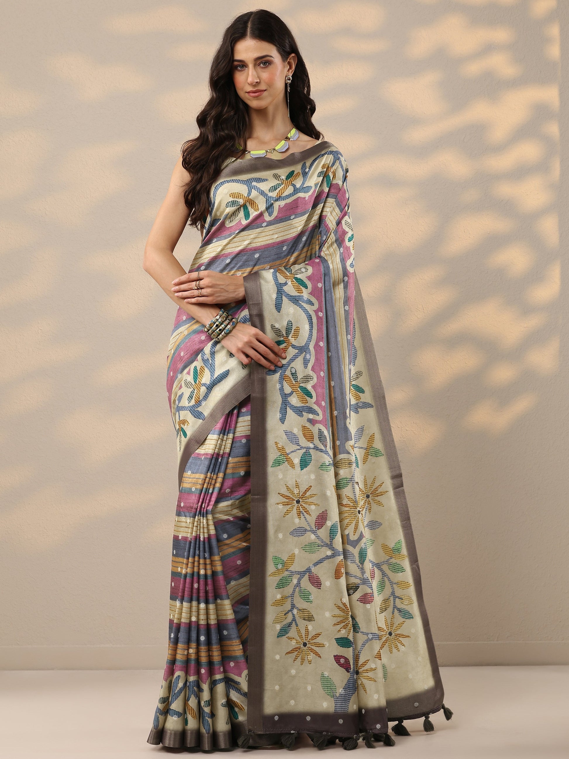 Multi Printed Silk Blend Saree With Unstitched Blouse Piece