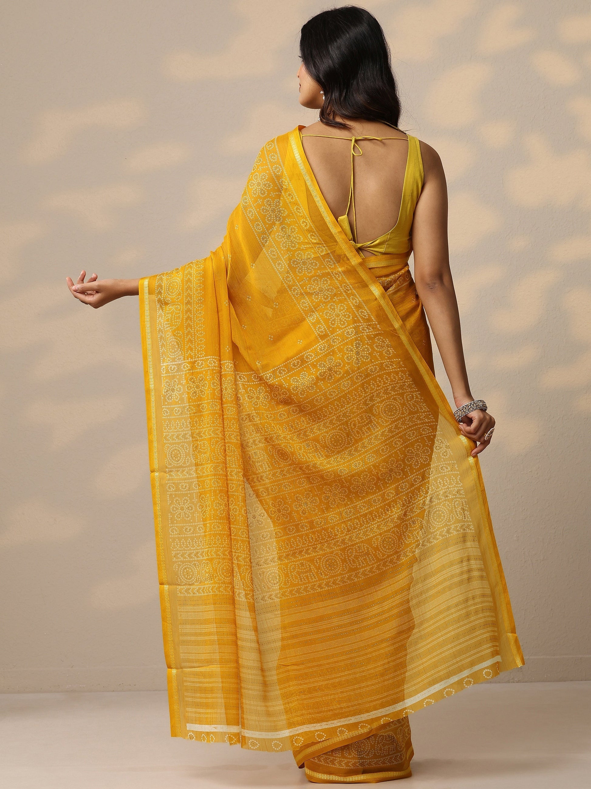 Mustard Bandhani Printed Chiffon Sarees With Unstitched Blouse Piece