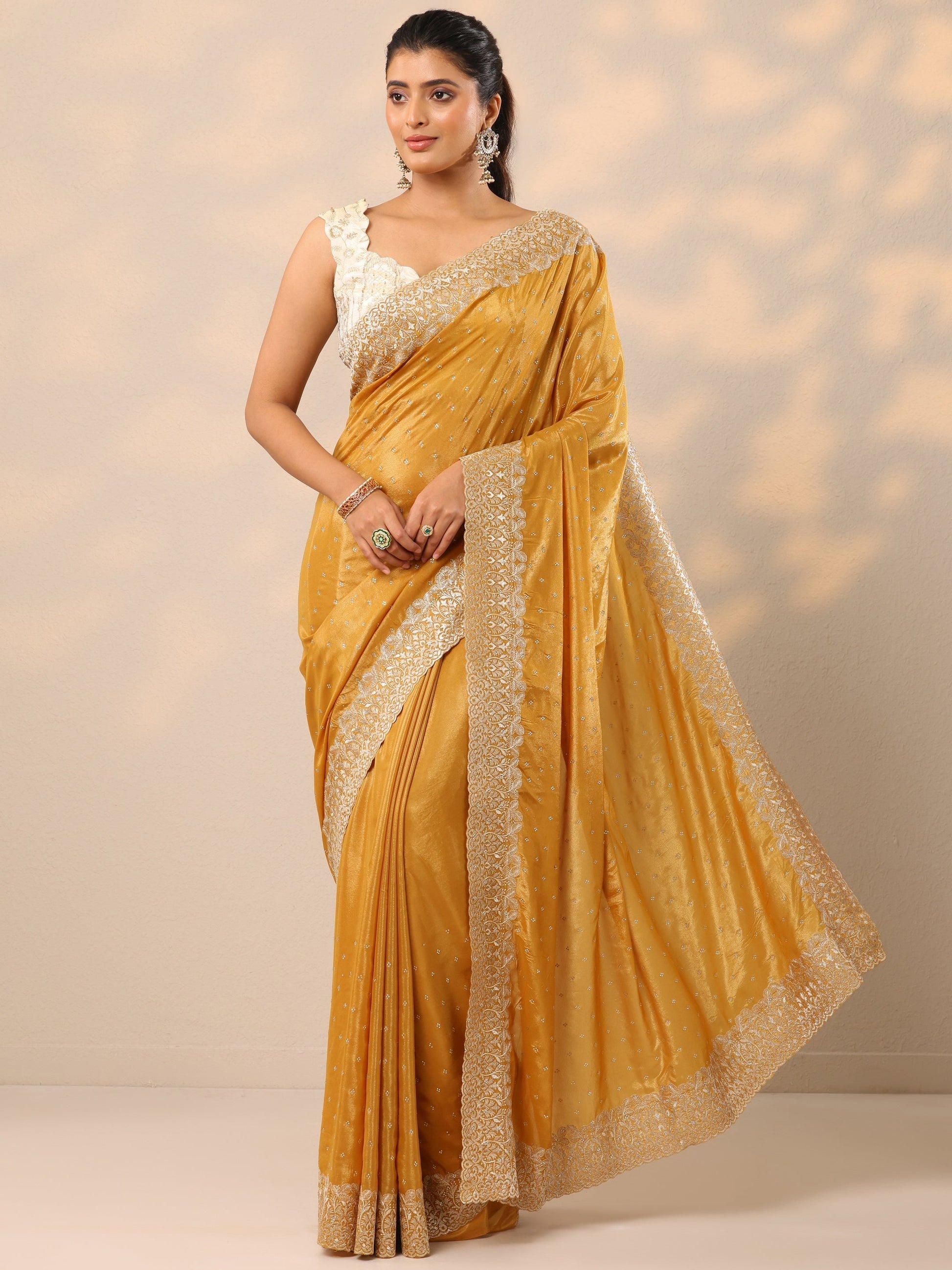 Mustard Embellished Crepe Sarees With Unstitched Blouse Piece