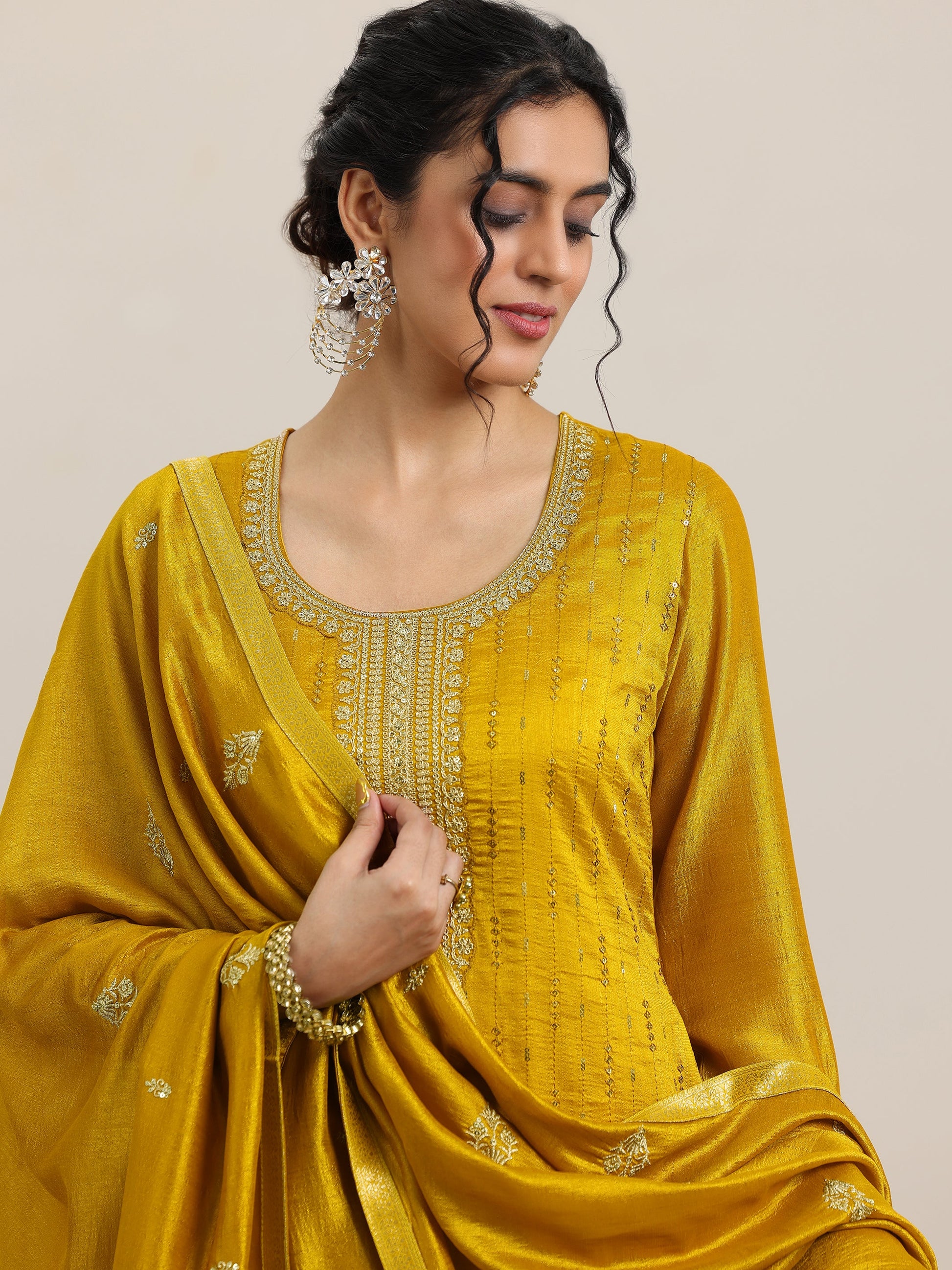 Mustard Embellished Silk Blend Straight Kurta With Palazzos & Dupatta