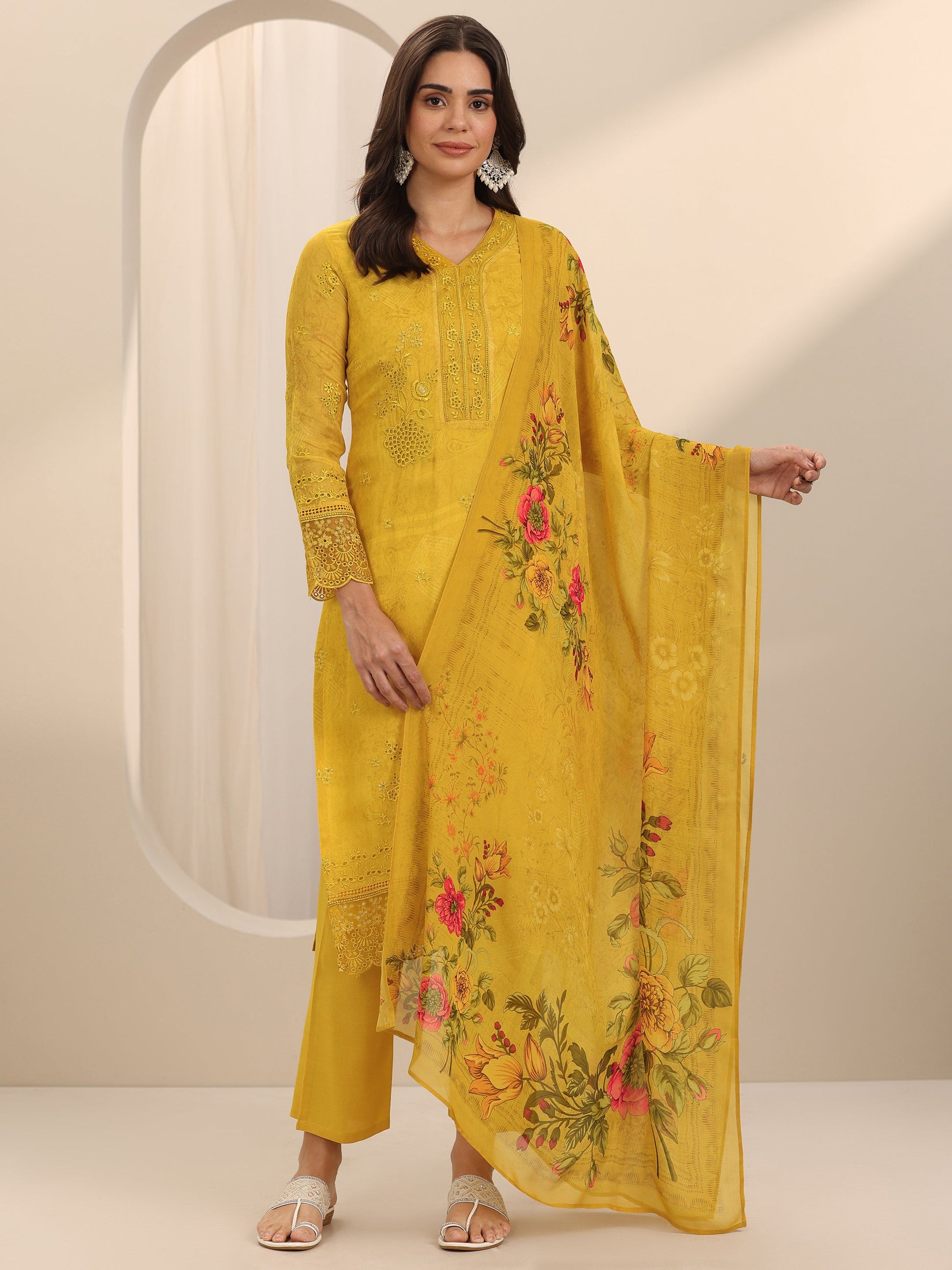 Mustard Embroidered Organza Straight Suit Set With Dupatta