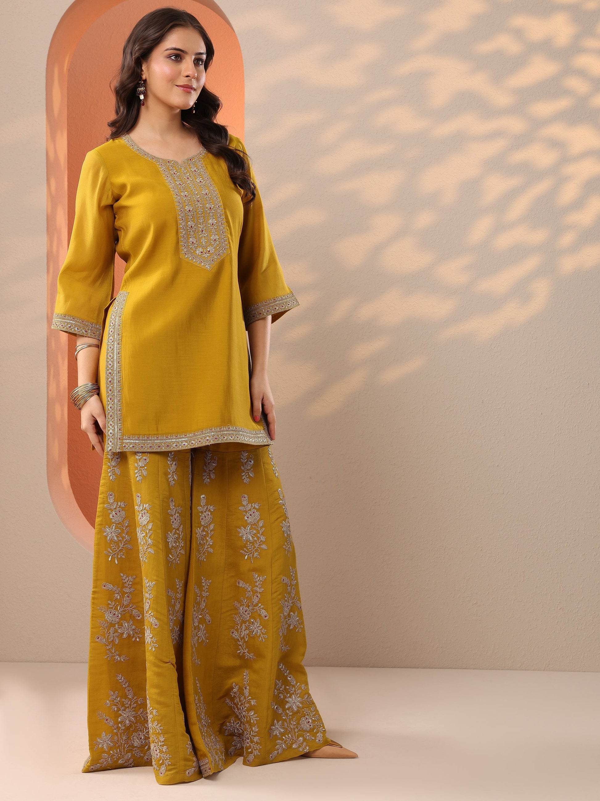 Our 3-piece mustard silk blend straight-fit kurta set features a round neckline, regular sleeves, and statement yoke. Complemented with lining and straight pants with a partially elasticated waistband and 2 pockets, and an embroidered dupatta. Adorned with embroidered embellishments, this style is perfect for festive occasions.