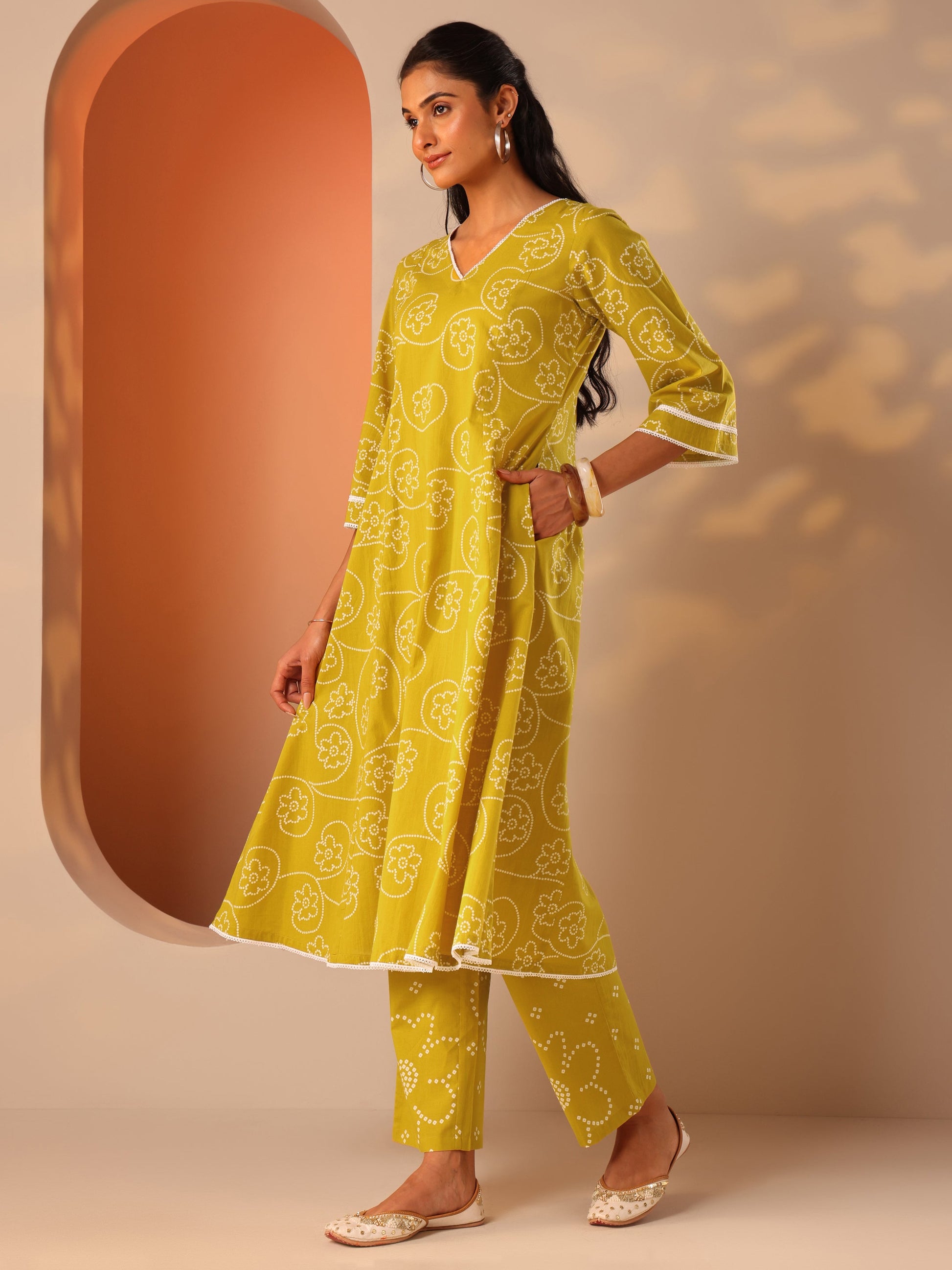 Mustard Printed Cotton A-Line Suit Set With Dupatta