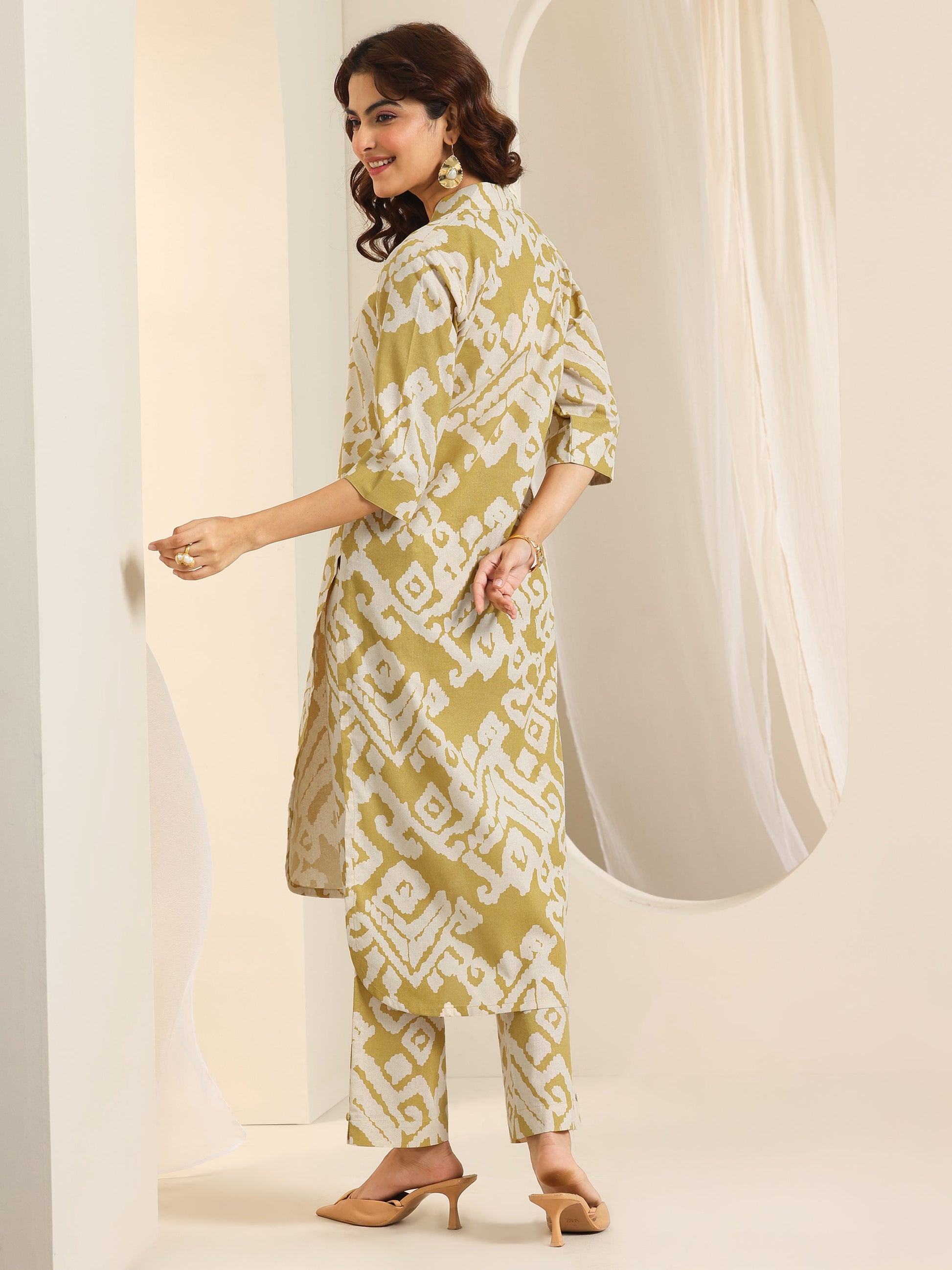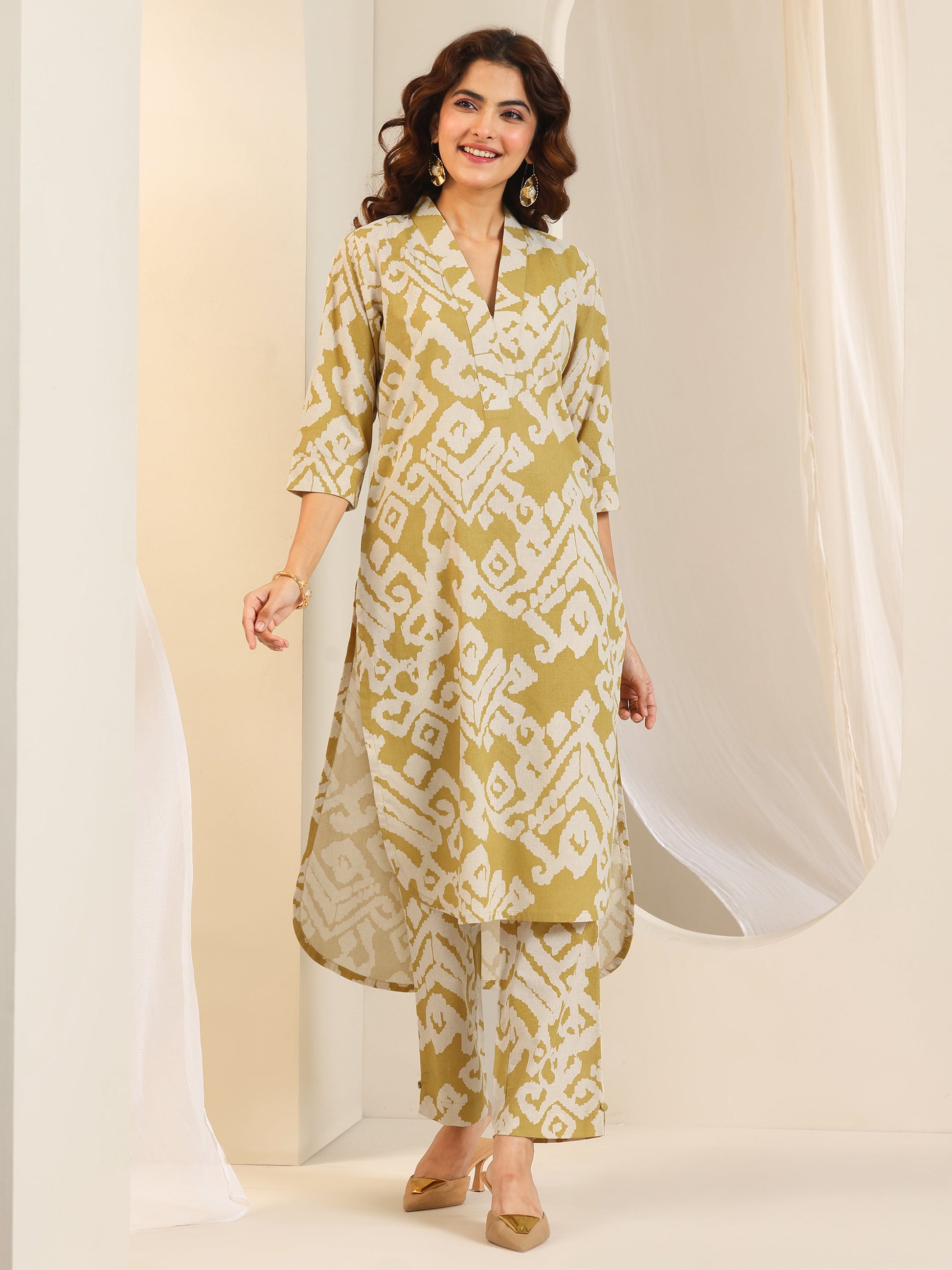 Our 2-piece Beige Cotton Blend features a Straight-fit Kurta with V-neckline, Regular Sleeves, and statement Yoke. Complemented with Palazzo Pants with an Elasticated waistband. Adorned with Printed accents, this style is perfect for Casual occasions.