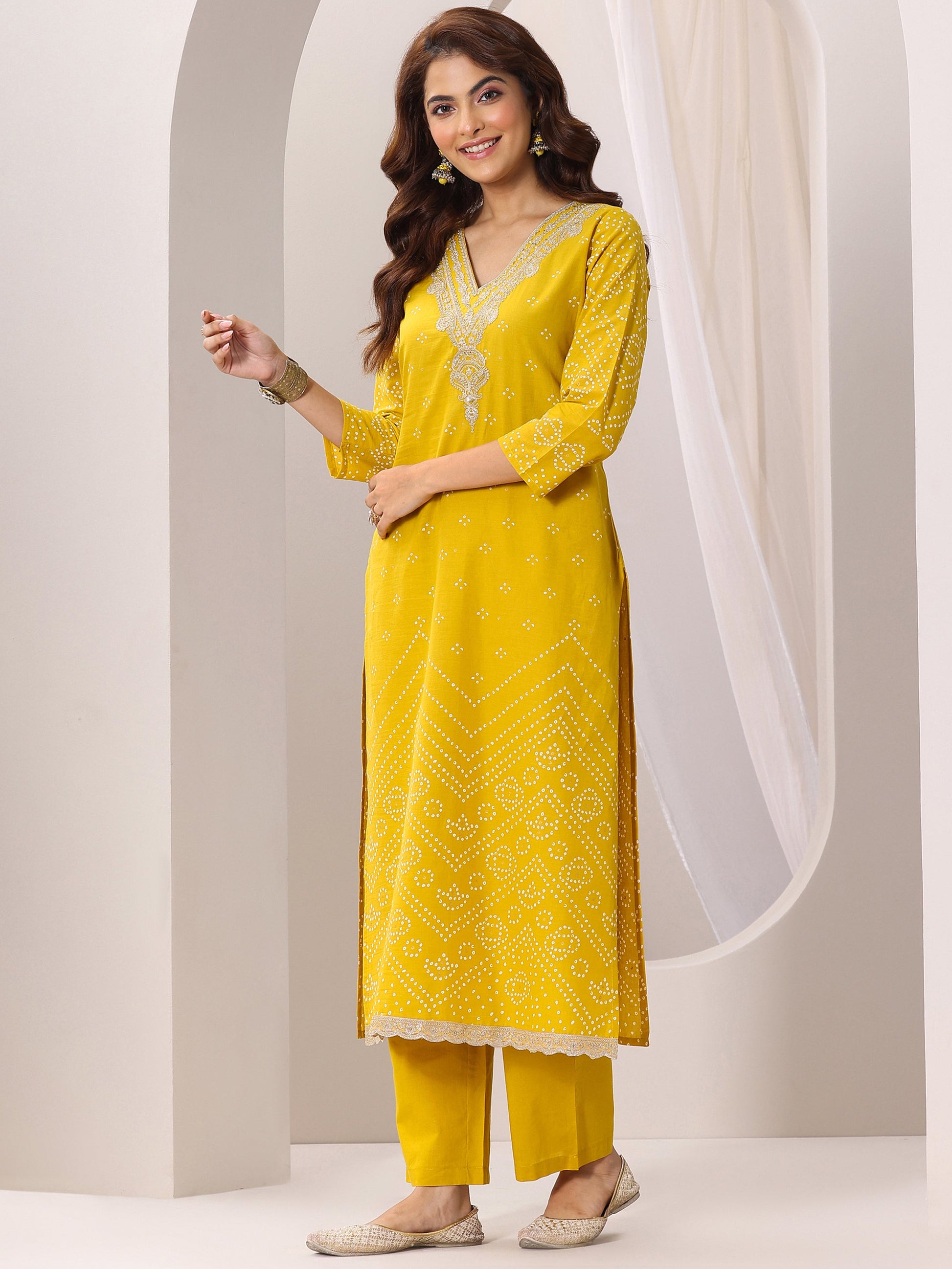 Our 3-piece mustard printed cotton straight suit set features a straight-fit kurta with a classic V-neckline, three-quarter sleeves, and a statement yoke. Complemented with straight trousers with a partially elasticated waistband and roomy pockets, and a matching dupatta. Adorned with bandhani inspired print and sequins accents, this style is perfect for light festivities.