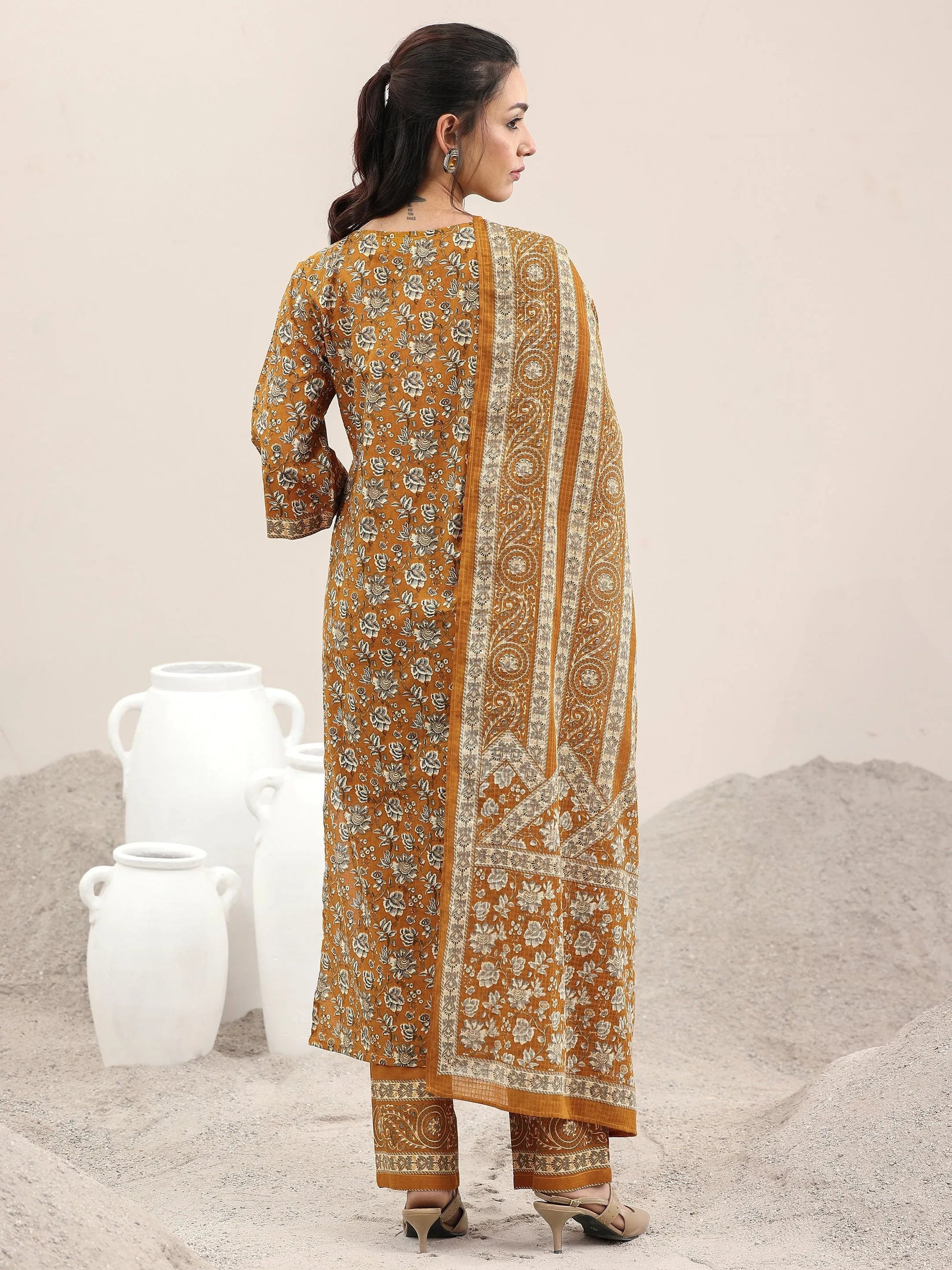 Our 3-piece brown cotton straight-fit kurta set features a V-neckline, regular sleeves, and a statement yoke. Complemented with straight pants with an elasticated waistband and a printed dupatta. Adorned with floral prints, this style is perfect for casual occasions.