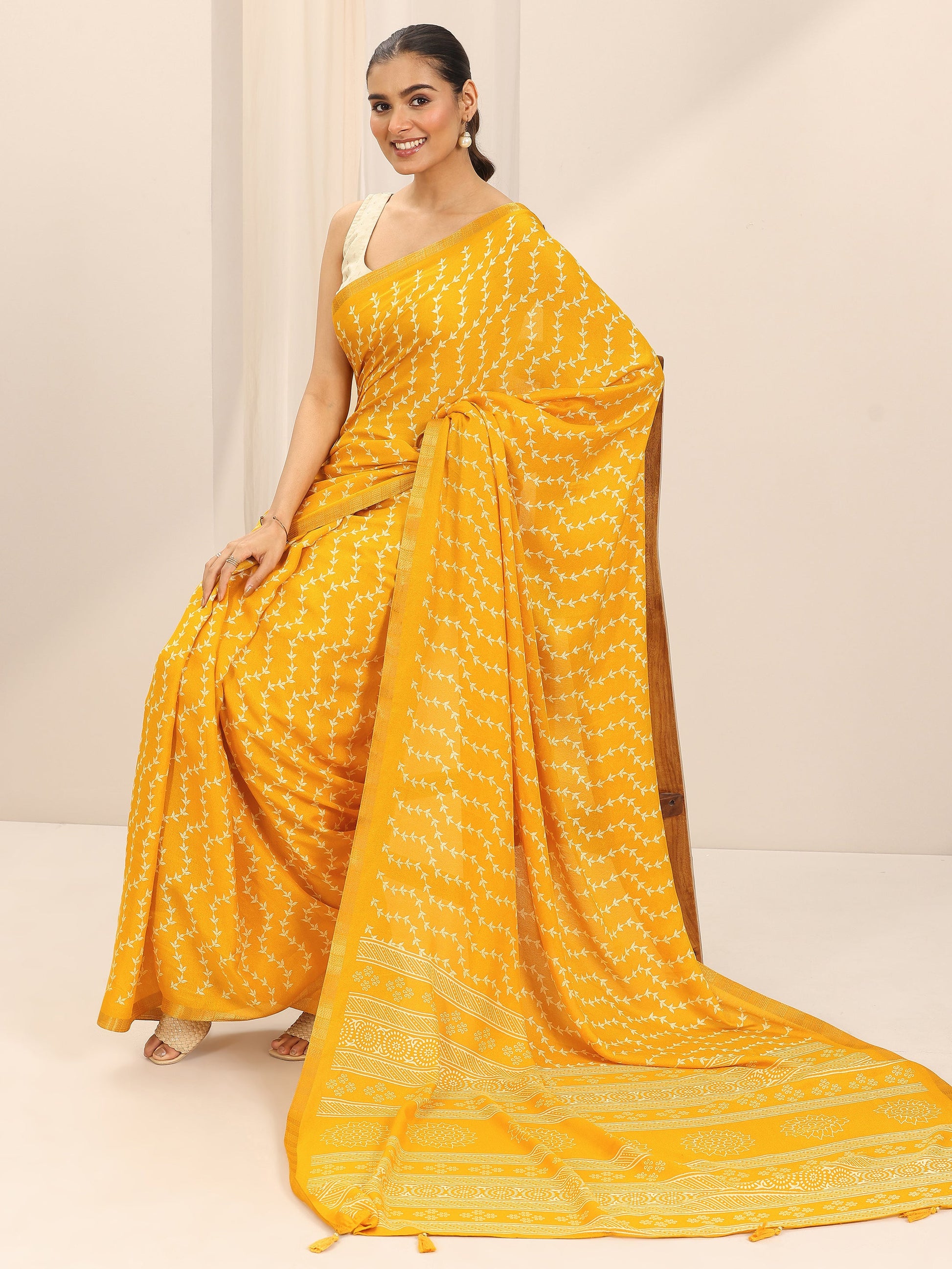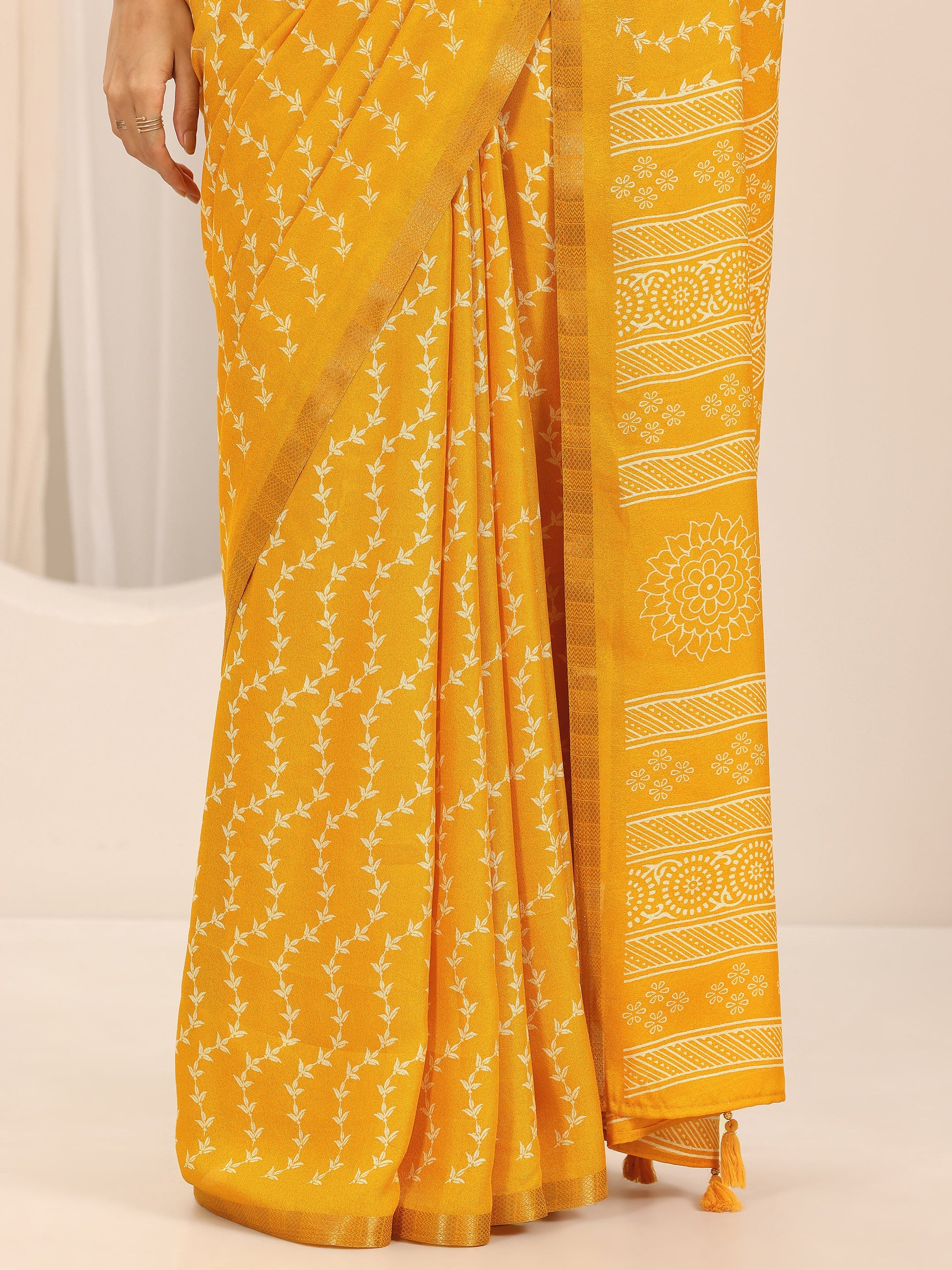 Mustard Printed Georgette Saree With Unstitched Blouse Piece