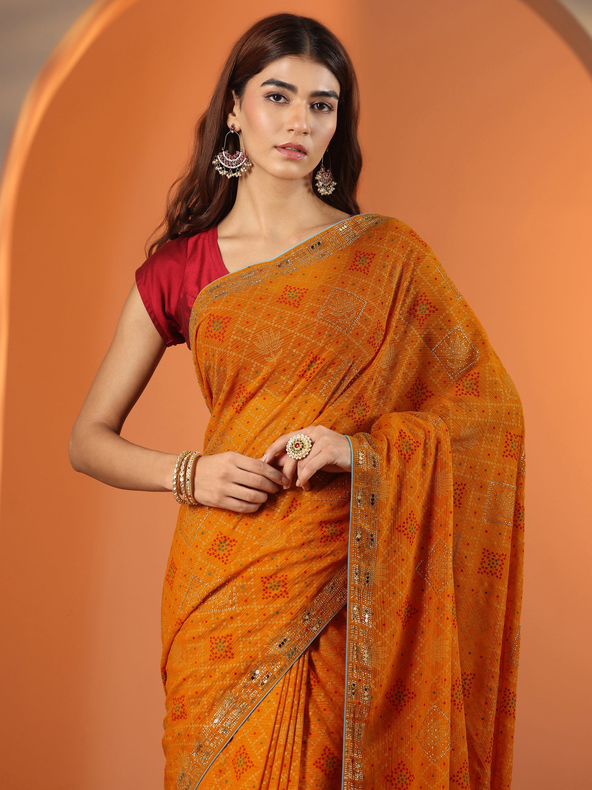 Our Mustard Printed Georgette Saree. Complemented With A Unstitched Blouse Piece. This Charming Saree Is Perfect For Festive Wear