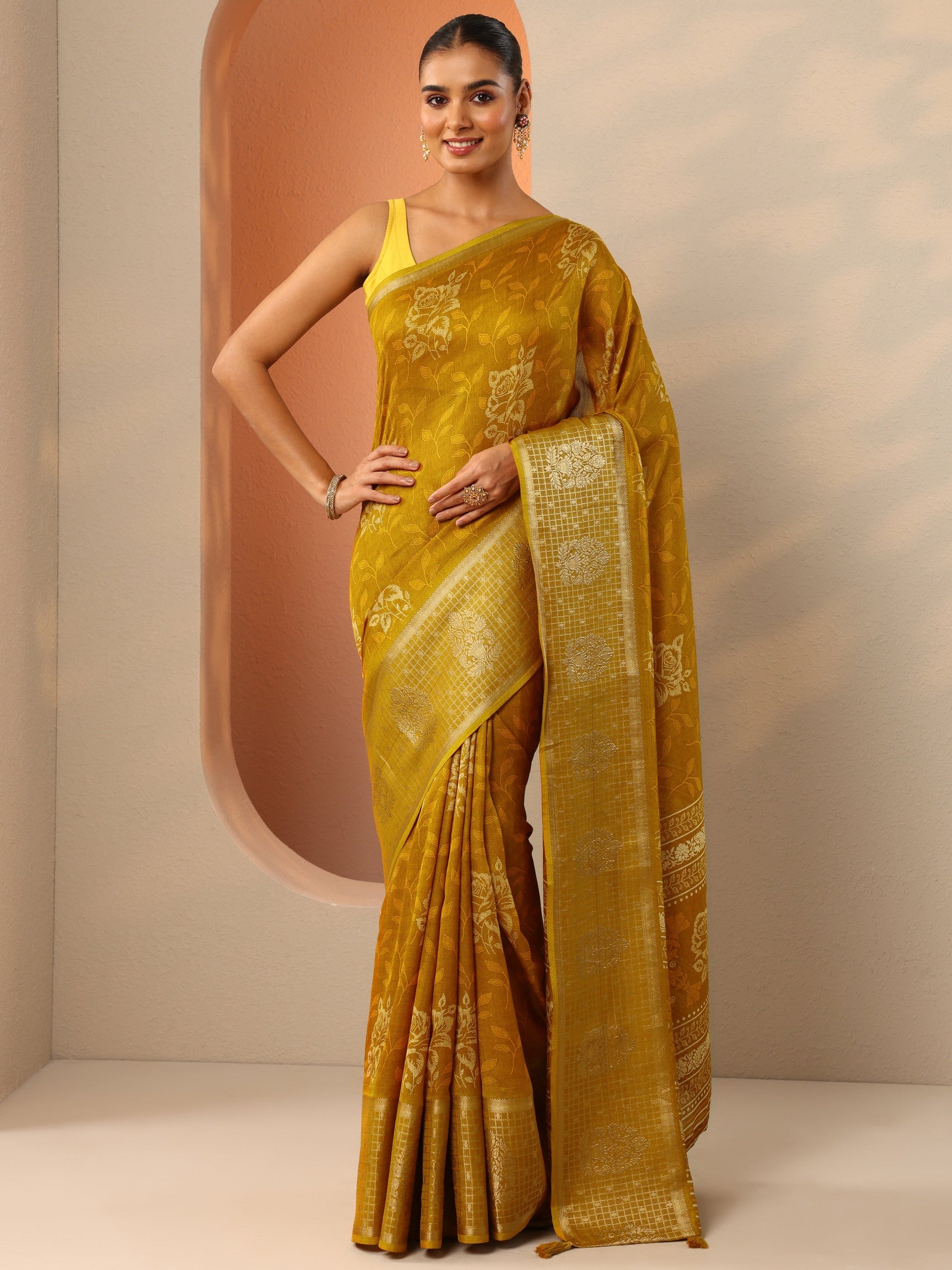 Mustard Printed Georgette Saree With Unstitched Blouse Piece