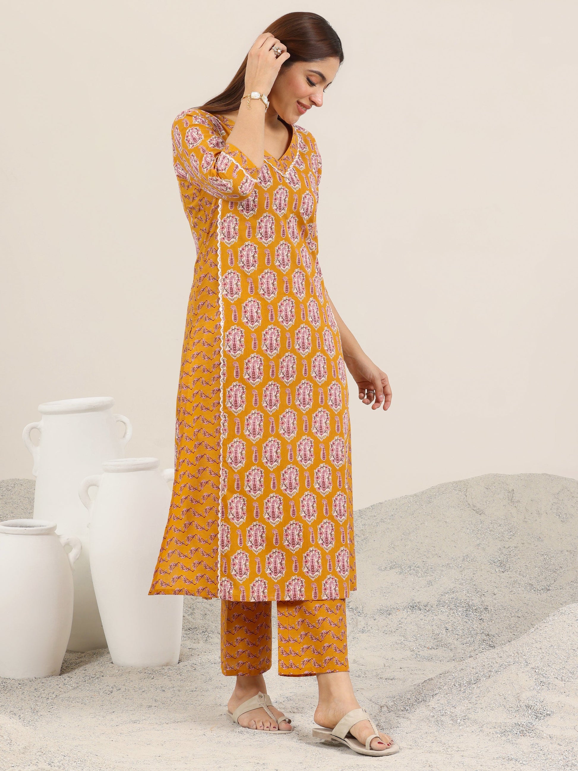 Our 2-piece Yellow Cotton Straight-fit features a V-Neckline, Regular Sleeves, and statement Yoke. Complemented with Straight Pants with a Partially Elasticated waistband and Roomy Pockets. Adorned with Floral Prints, this style is perfect for Casual wear.