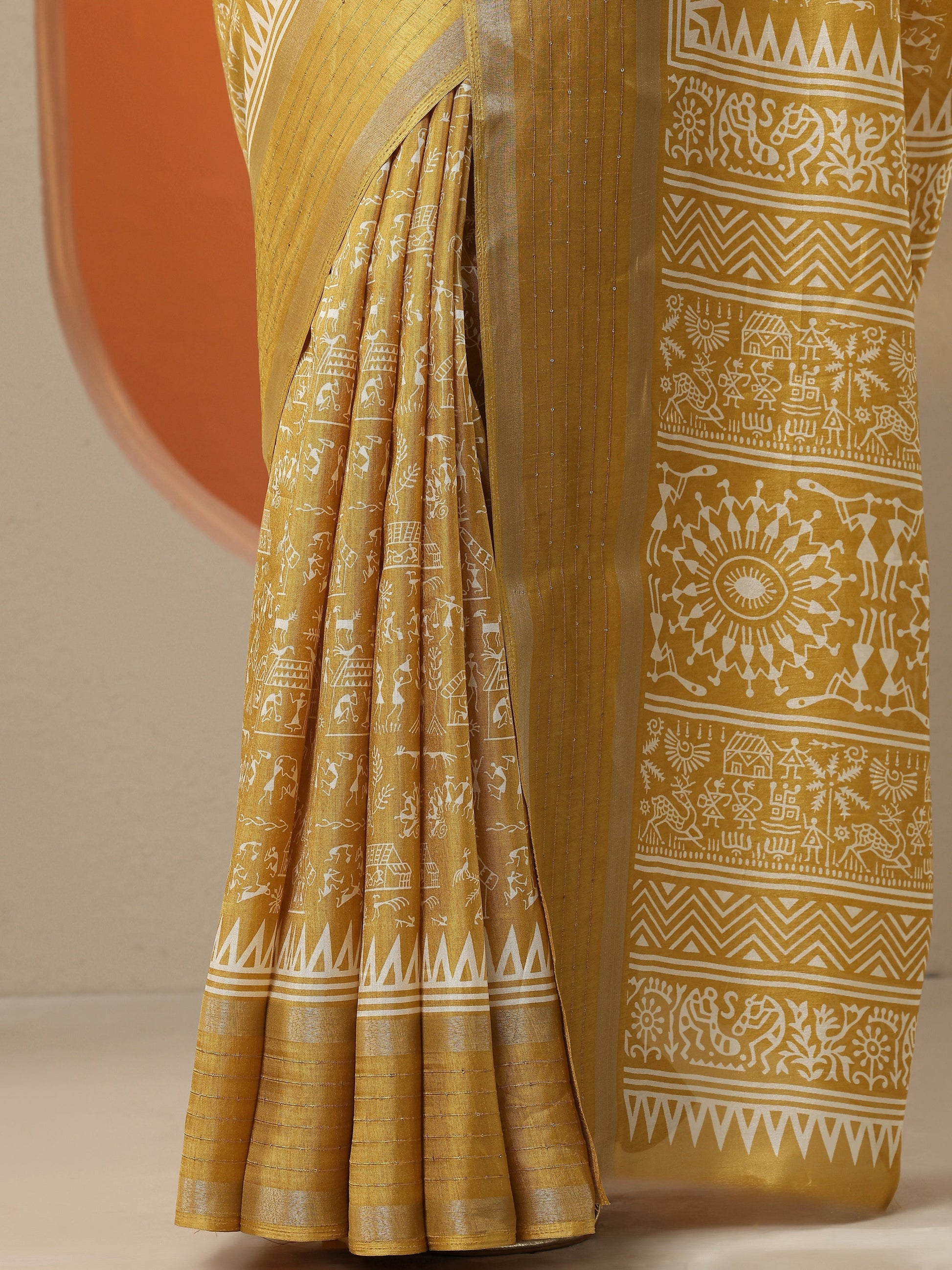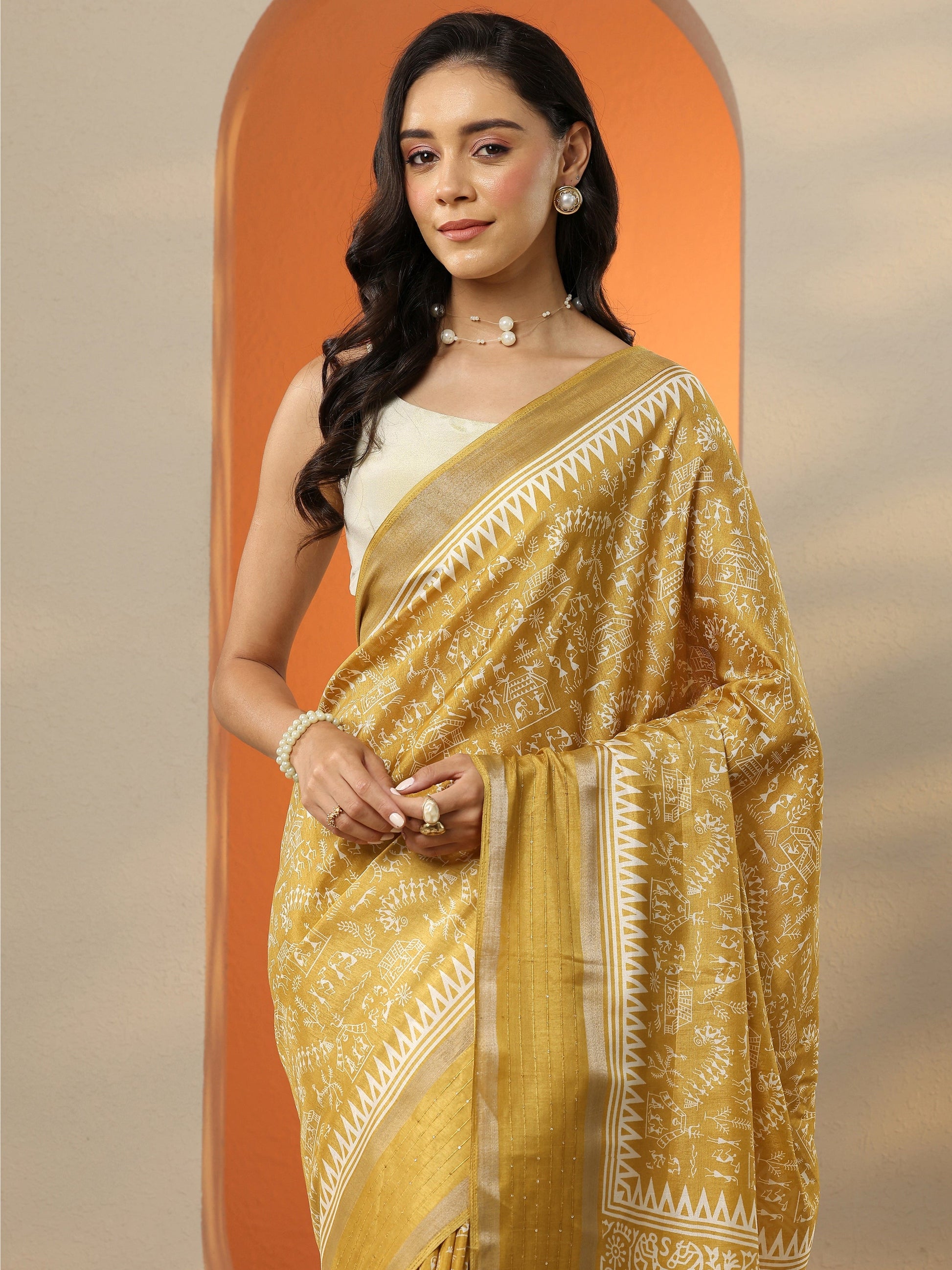 Mustard Printed Silk Blend Saree With Unstitched Blouse Piece