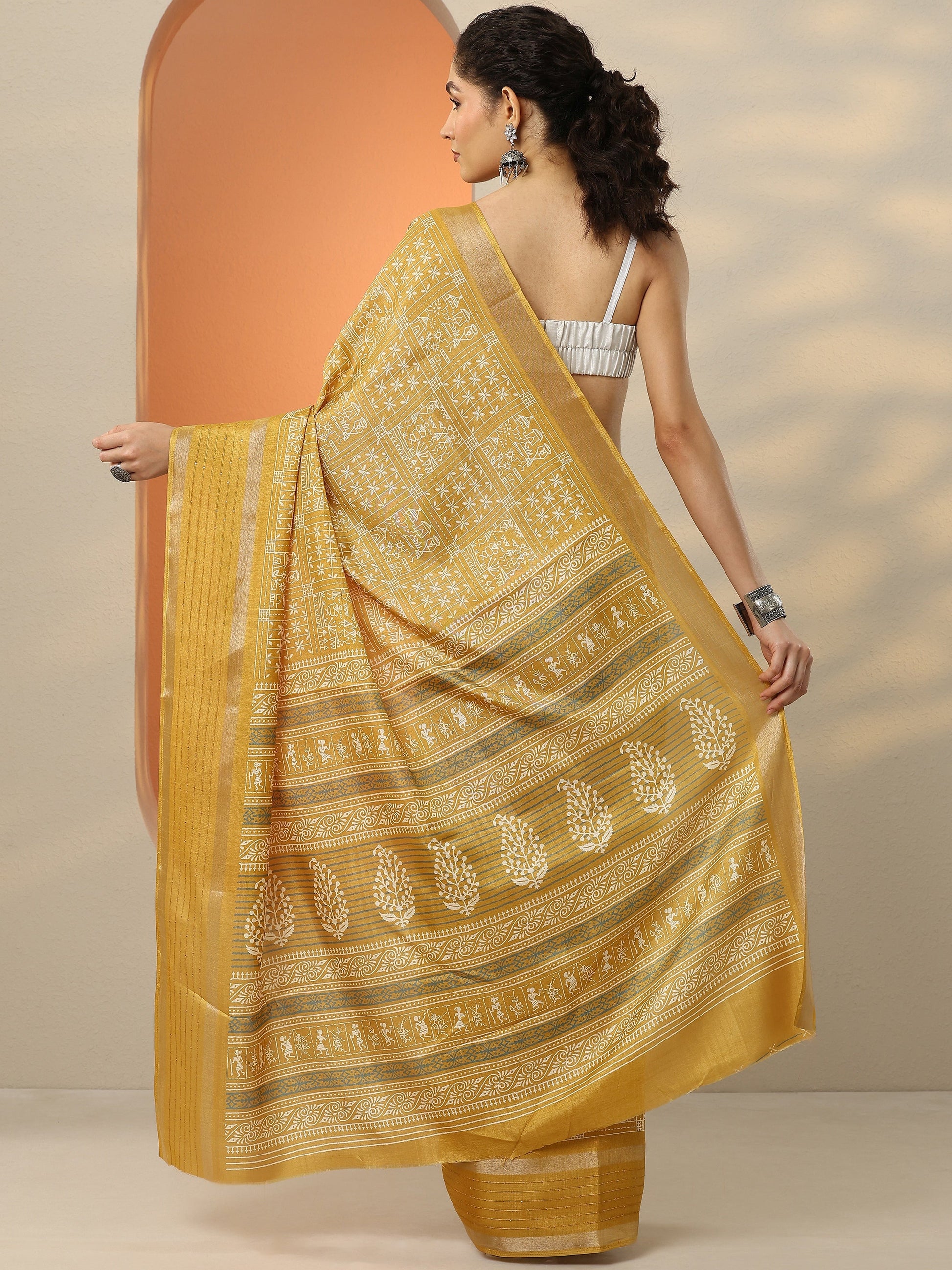 Mustard Printed Silk Blend Saree With Unstitched Blouse Piece
