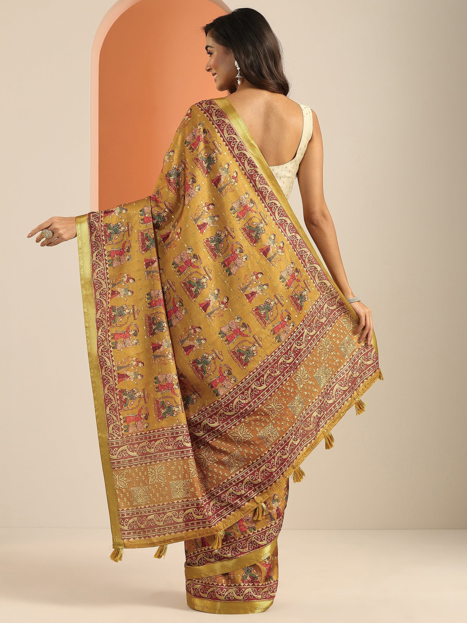 Mustard Printed Silk Blend Saree With Unstitched Blouse Piece