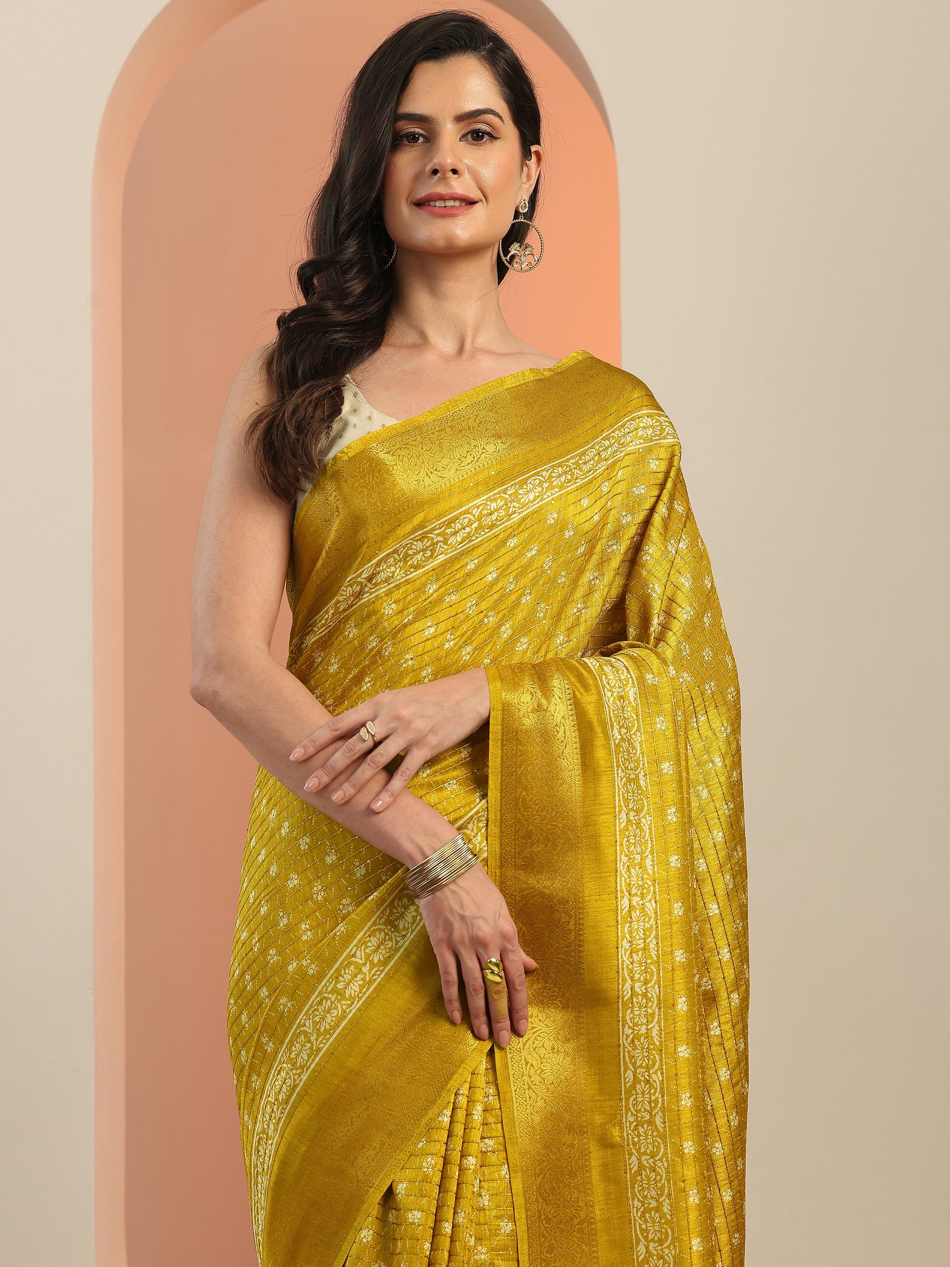 Our Mustard Printed Silk Blend Saree Features Captivating Woven Design. Complemented With A Unstitched Blouse Piece. This Charming Saree Is Perfect For Festive Wear.