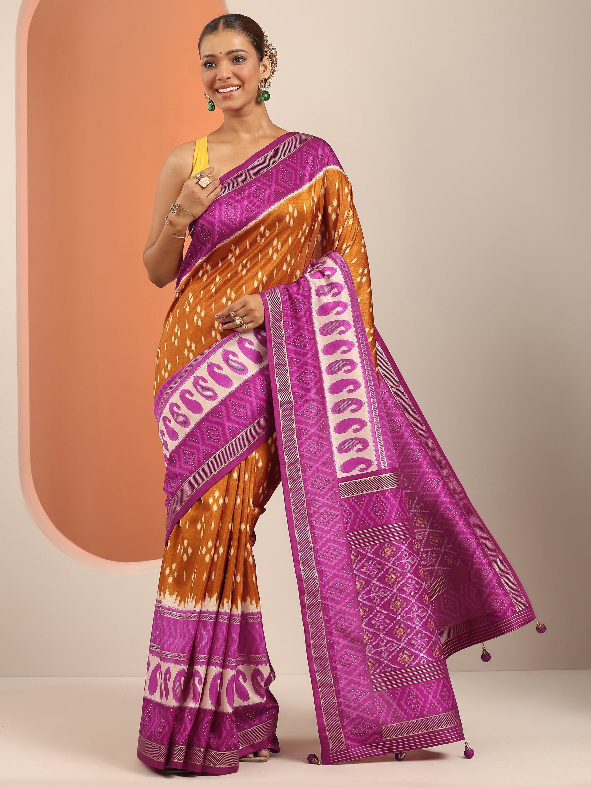 Our Mustard Printed Silk Blend Saree. Complemented With A Unstitched Blouse Piece. This Charming Saree Is Perfect For Festive Wear