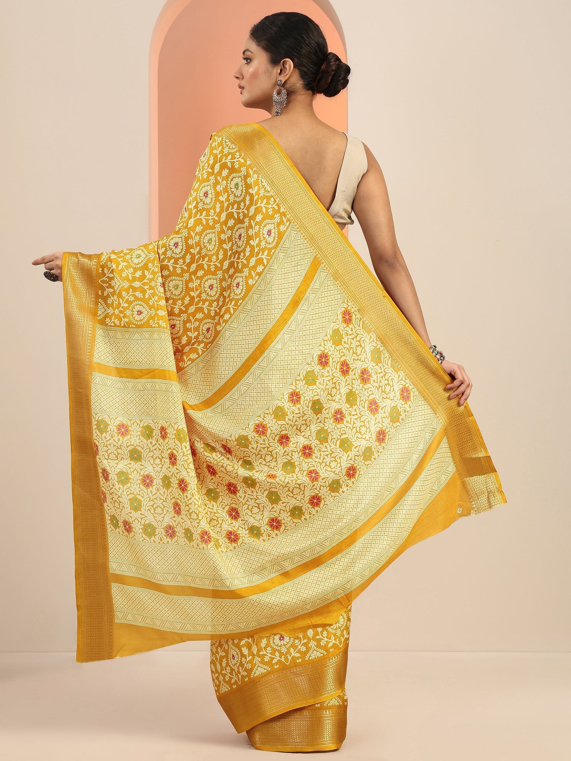 Mustard Printed Silk Blend Saree With Unstitched Blouse Piece
