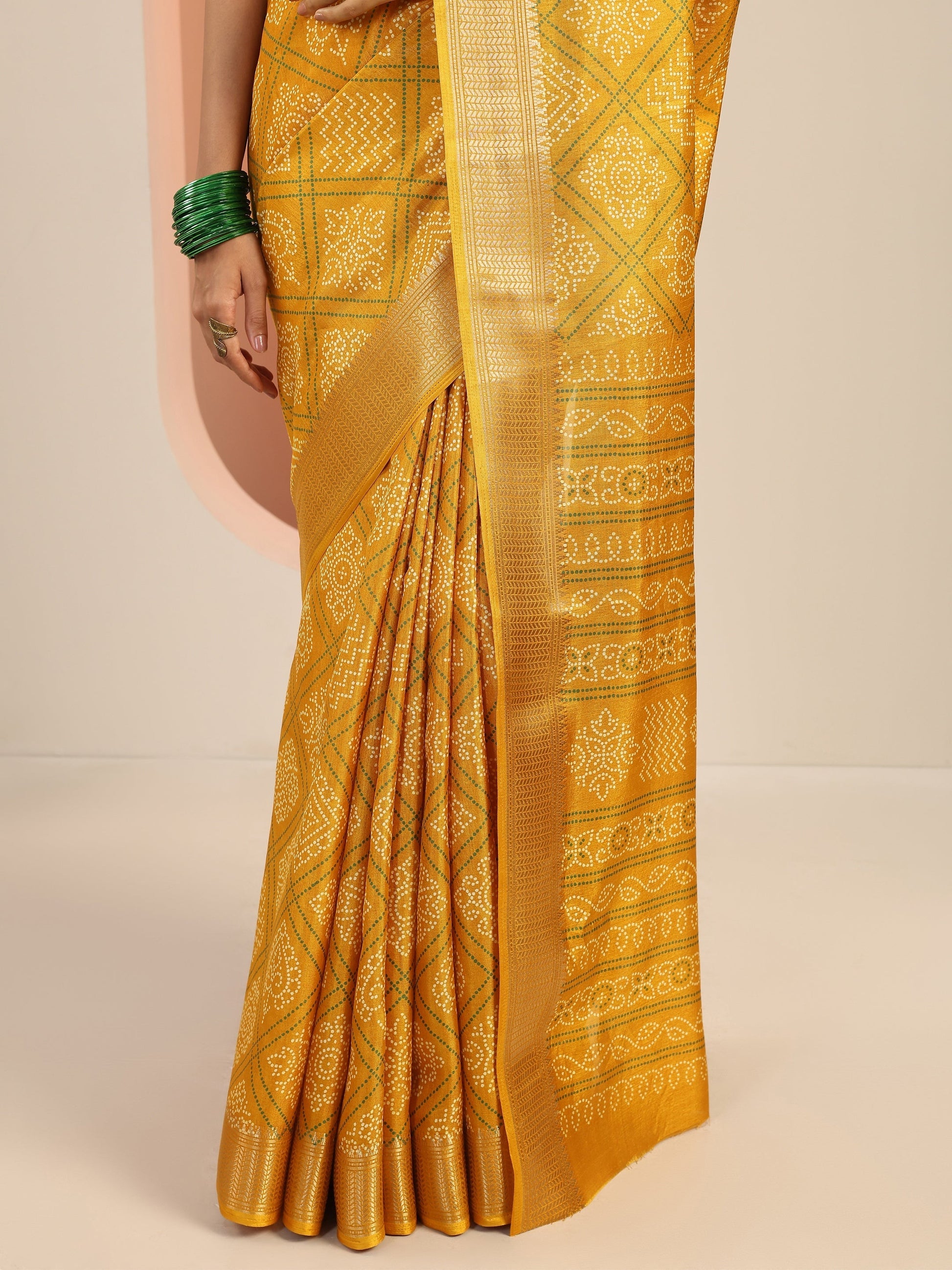 Our Gold Printed Silk Blend Saree Features Captivating Bandhani Printed Design. Complemented With An Unstitched Blouse Piece. This Charming Saree Is Perfect For Festive Wear