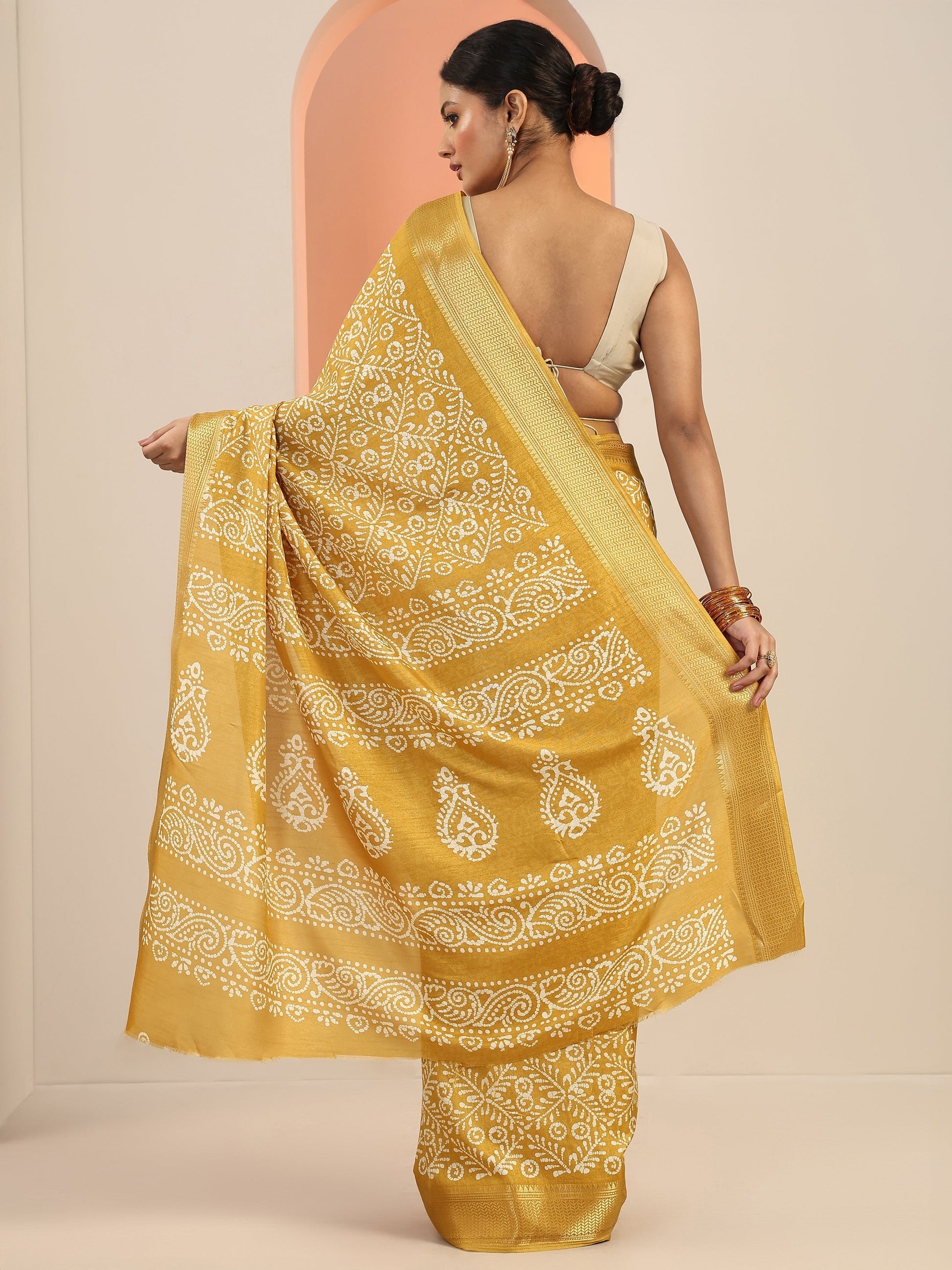 Mustard Printed Silk Blend Saree With Unstitched Blouse Piece