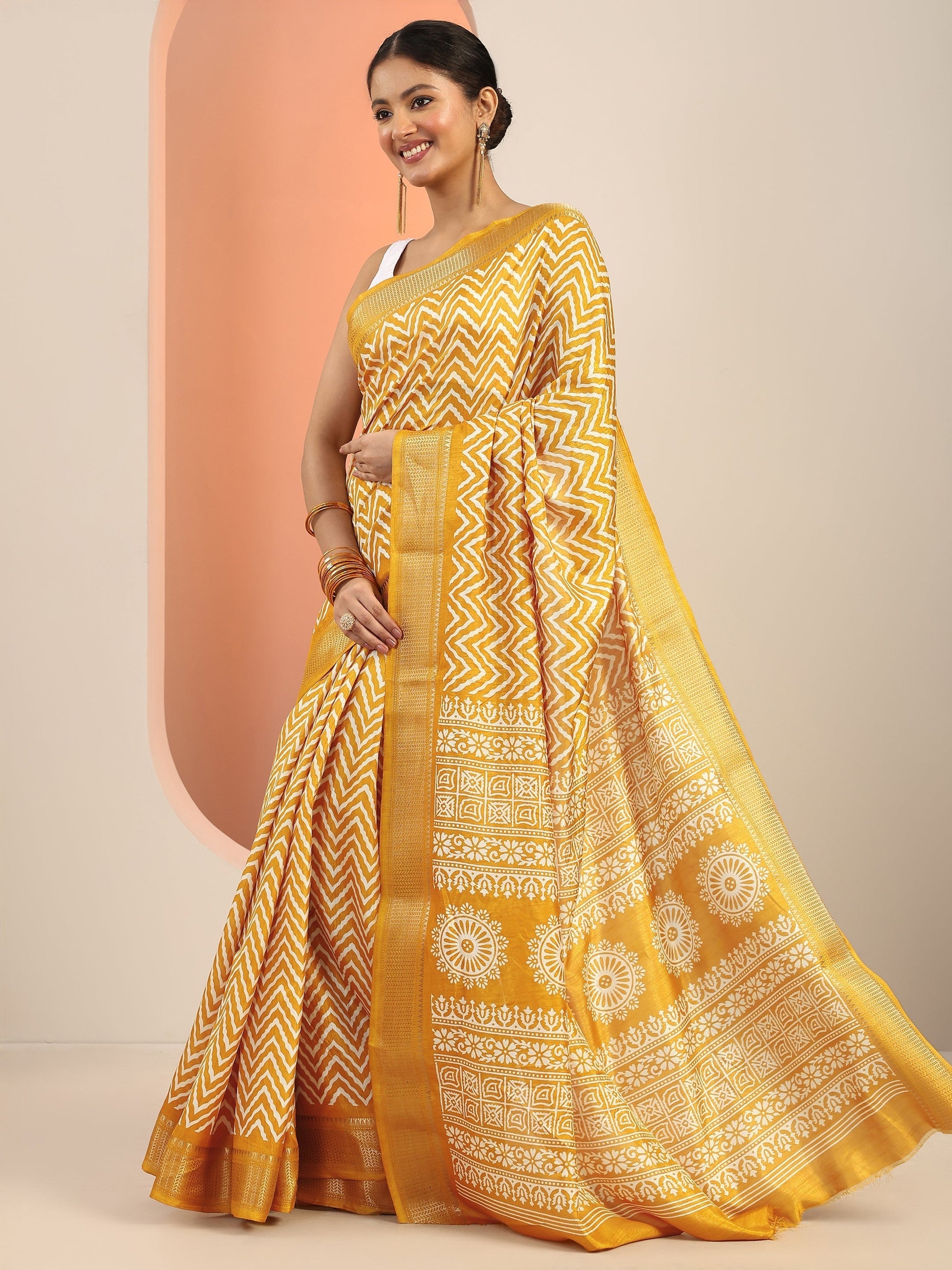 Mustard Printed Silk Blend Saree With Unstitched Blouse Piece