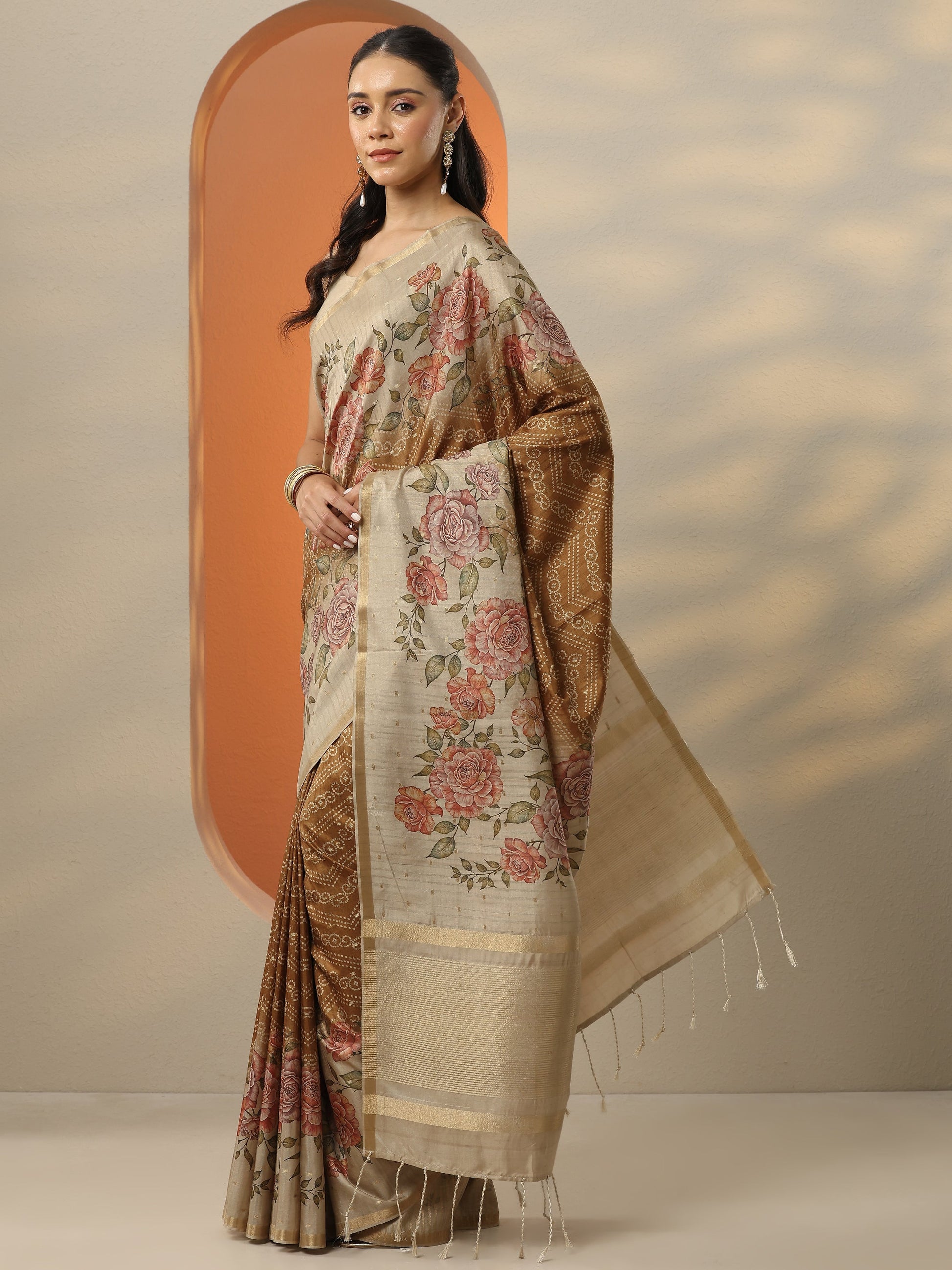 Mustard Printed Silk Blend Saree With Unstitched Blouse Piece