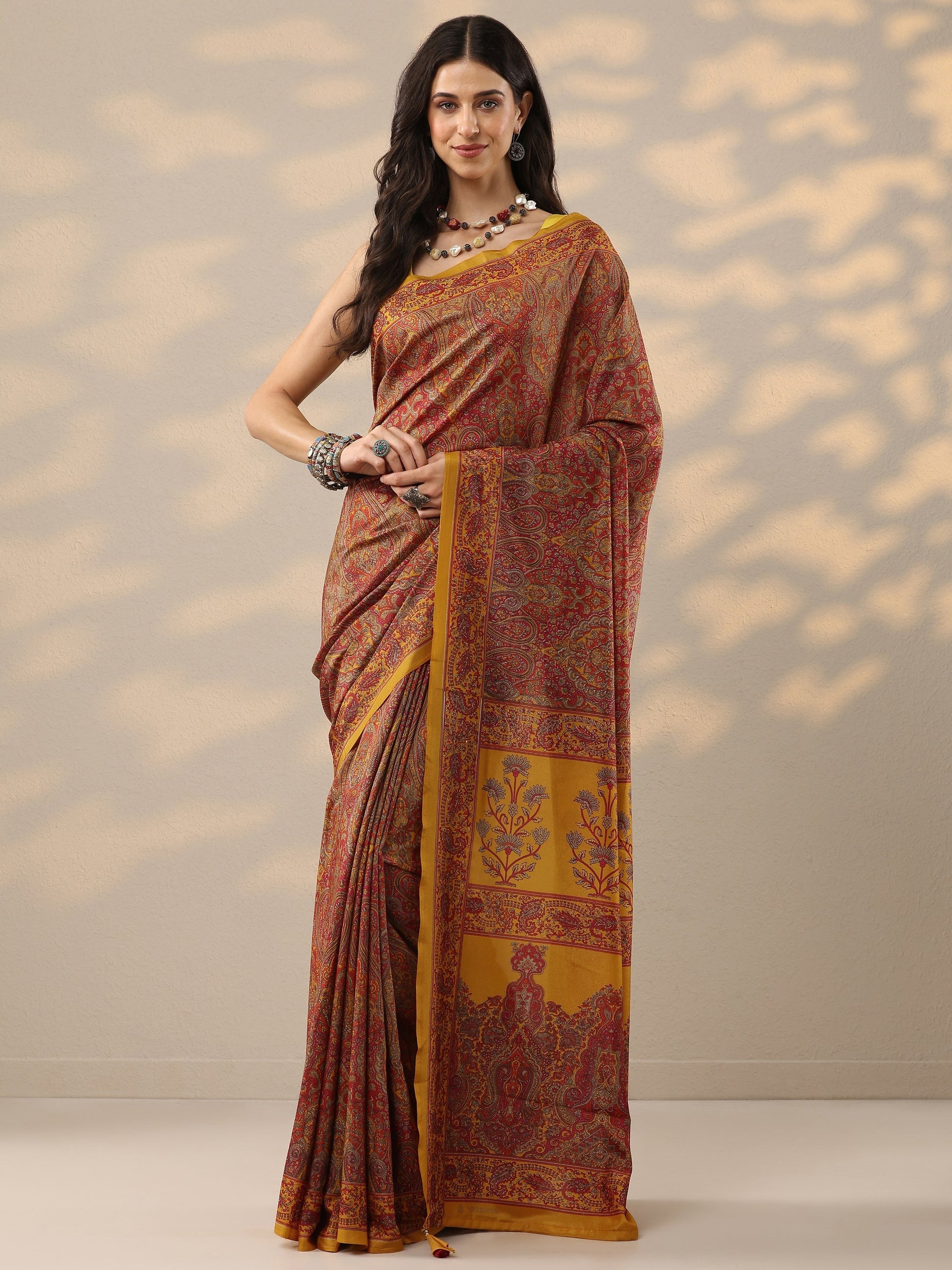 Mustard Printed Silk Blend Saree With Unstitched Blouse Piece