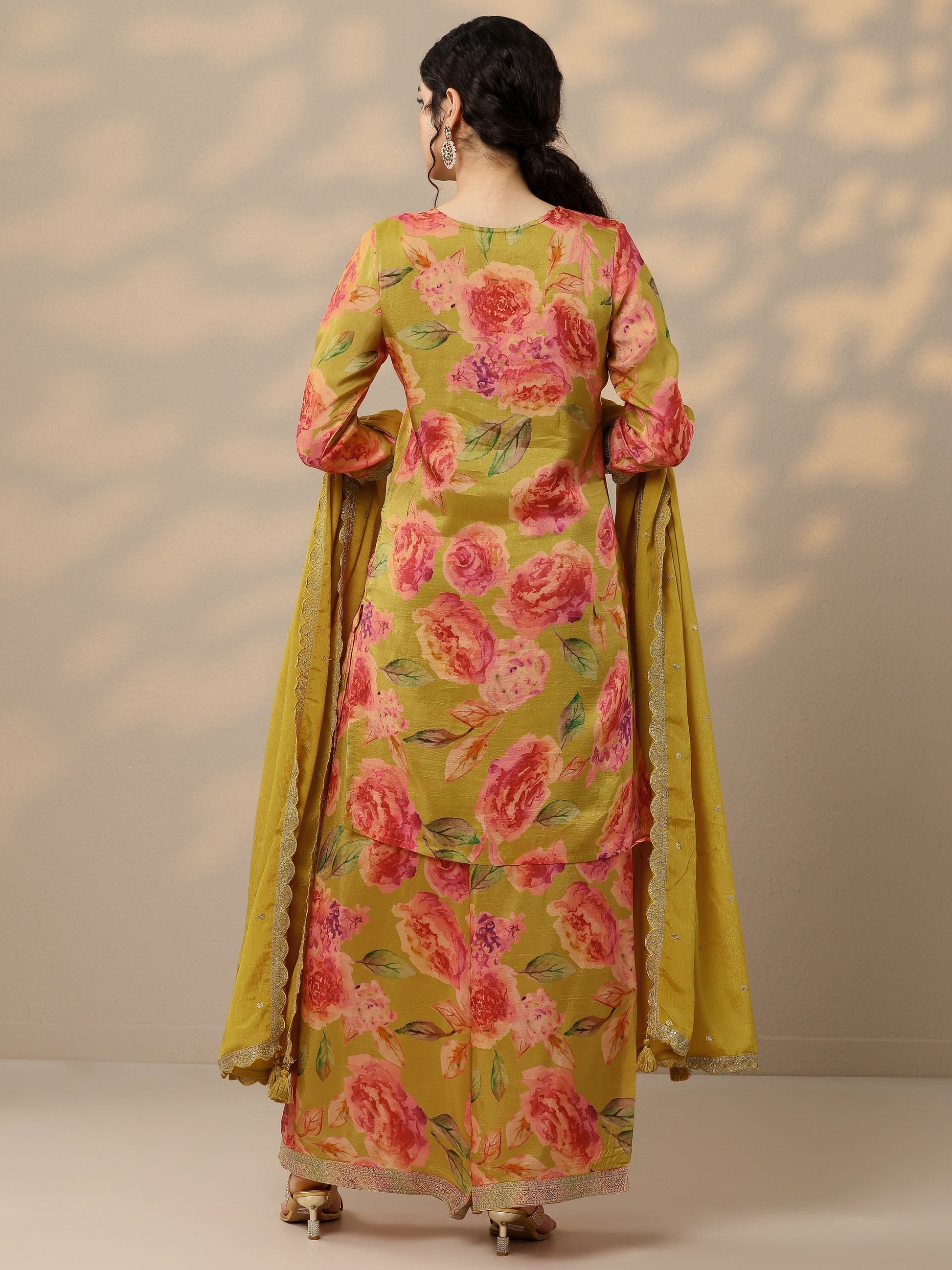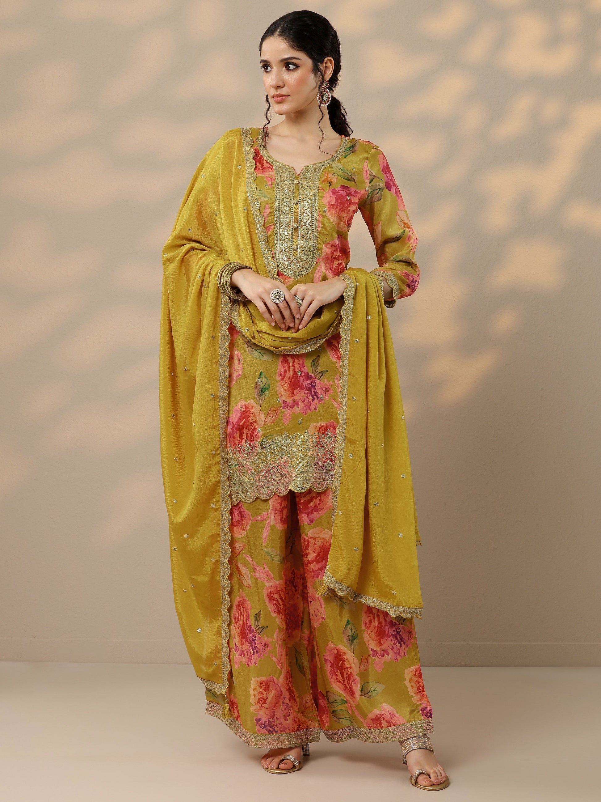 Mustard Printed Silk Blend Straight Suit Set With Dupatta