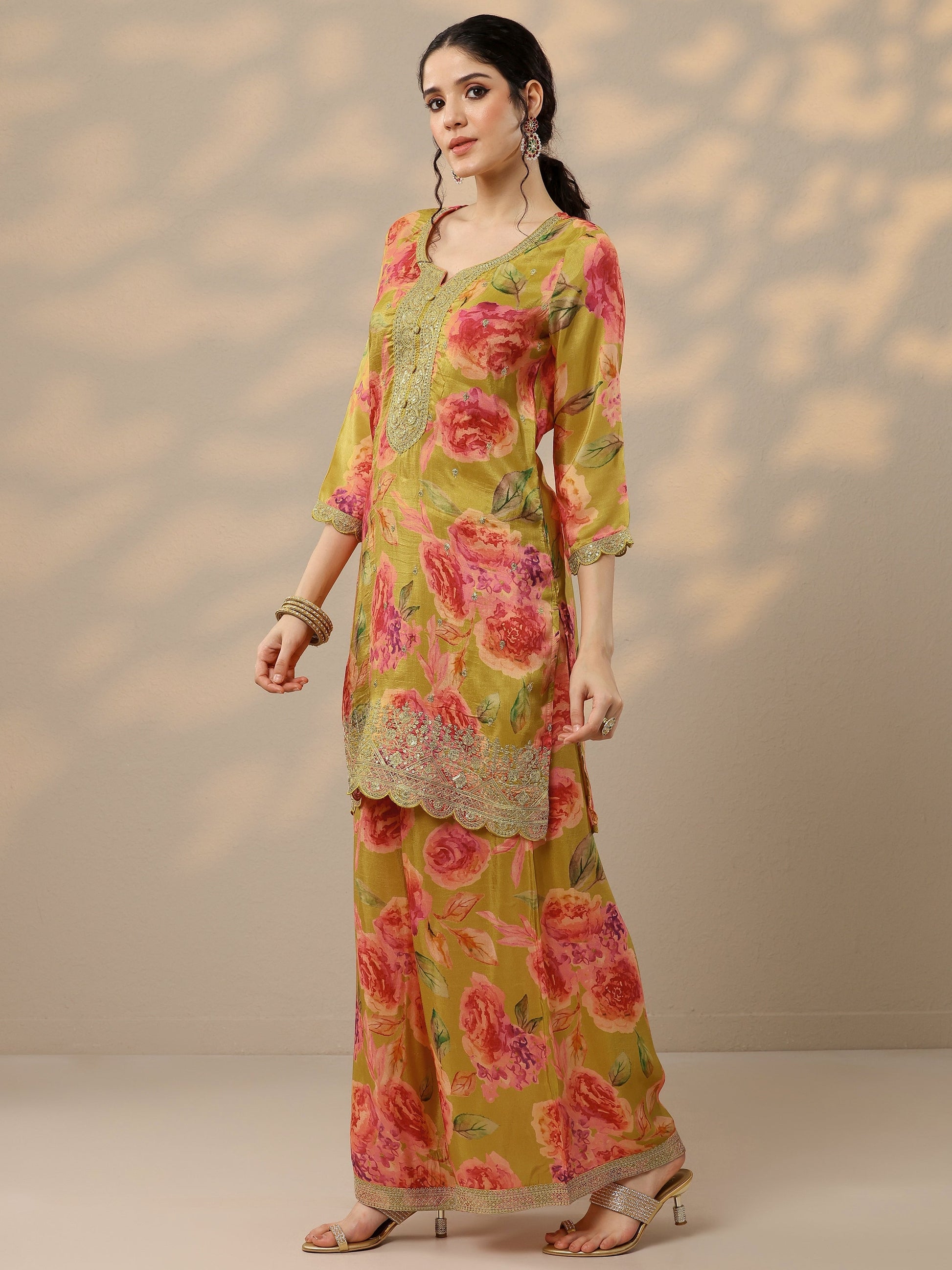 Our 3-piece yellow silk blend straight-fit kurta set features a sweetheart neckline, regular sleeves, and statement yoke. Complemented with lining and palazzo pants with a partially elasticated waistband and 2 pockets, and a solid dupatta. Adorned with floral accents, this style is perfect for festive occasions.