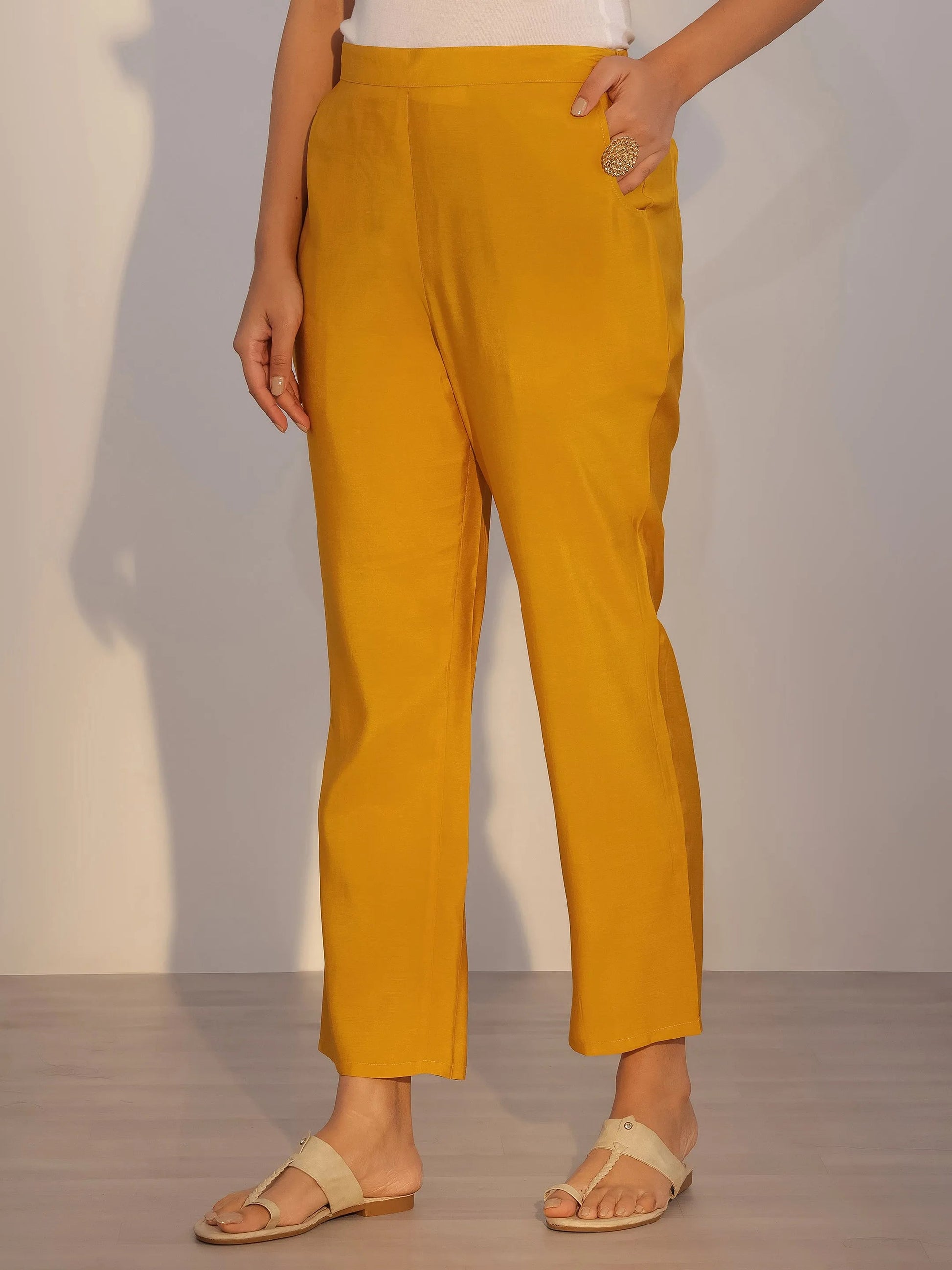 Our 3-piece mustard printed silk blend straight suit set features a straight-fit kurta with a keyhole neckline and three-quarter sleeves. Adorned with matching straight pants with a partially elasticated waistband, roomy pockets, and a printed dupatta. Highlighted with floral prints and a striped pattern, this elegant style is ideal for work and beyond.
