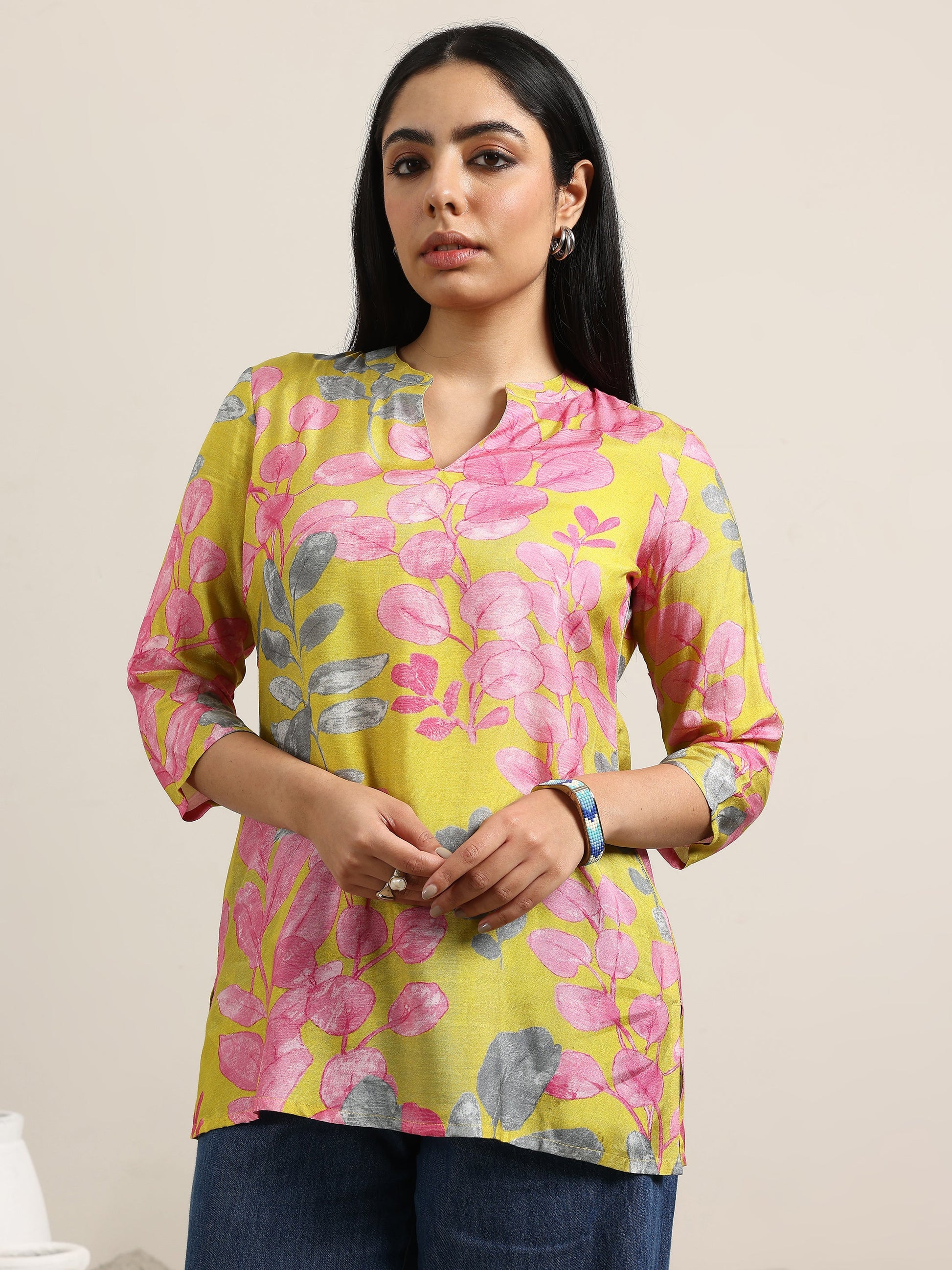 Our yellow printed Silk Blend kurti features a V-neck neckline and three-quarter sleeves. Highlighted with captivating printed embellishments, this style is perfect for festive occasions.