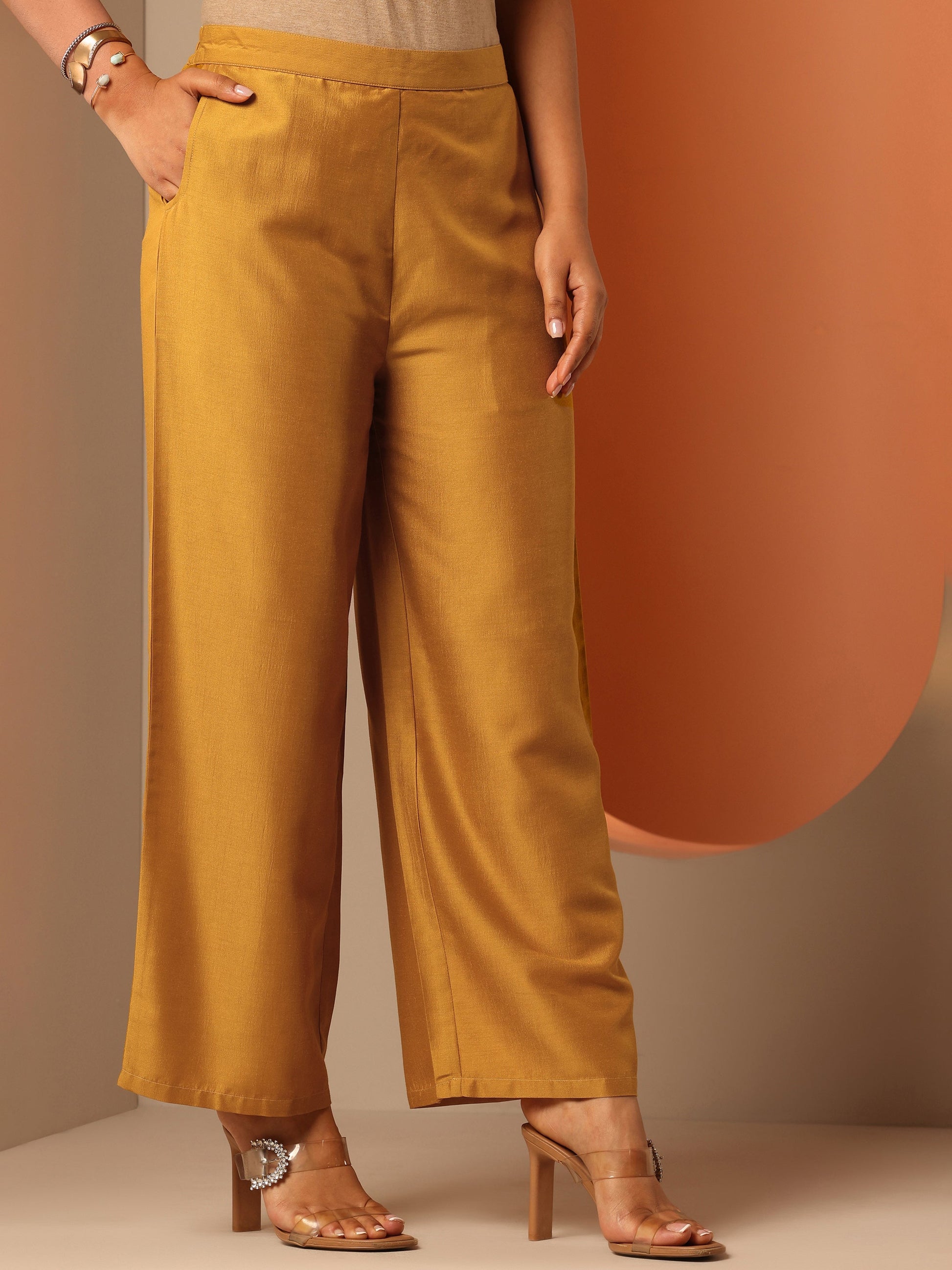 Our 3-piece Gold Silk blend Anarkali Kurta Set features a Round Neckline, Regular Sleeves, and statement Yoke. Complemented with Lining and Straight Pants with a Partially Elasticated waistband and 2 pockets, and a Dupatta. Adorned with Woven Design, this style is perfect for Festive wear.