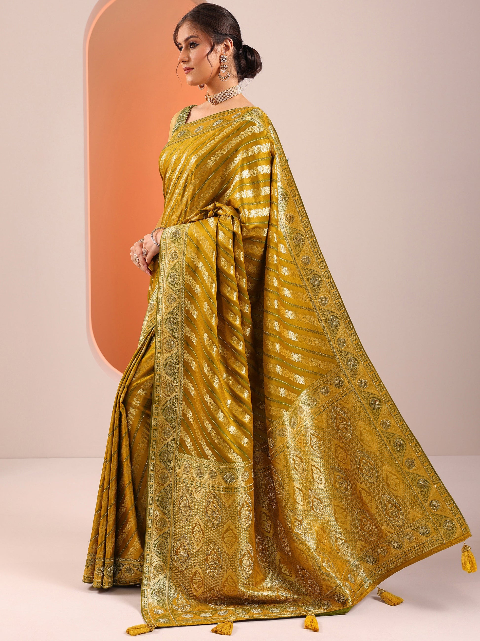 Our Mustard Woven Design Silk Blend Saree. Complemented With A Unstitched Blouse Piece. This Charming Saree Is Perfect For Festive Wear