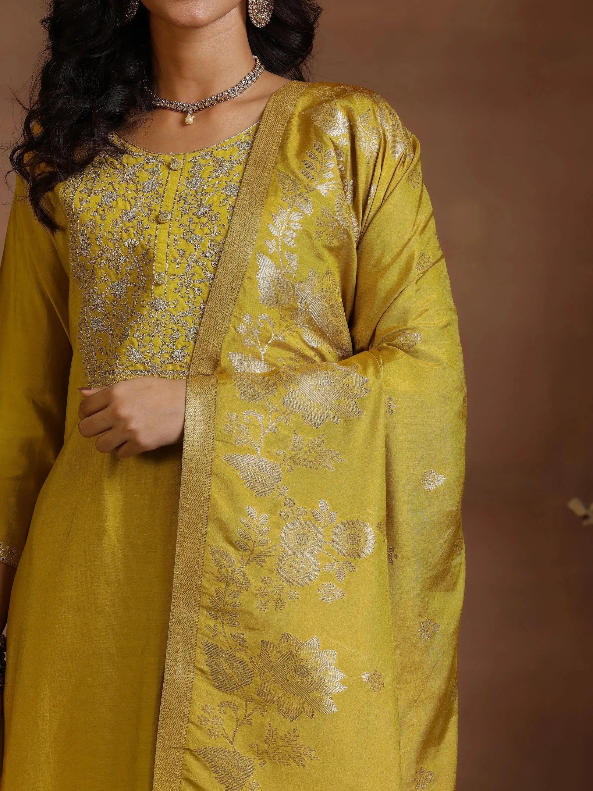 Mustard Yoke Design Silk Blend Straight Suits With Dupatta