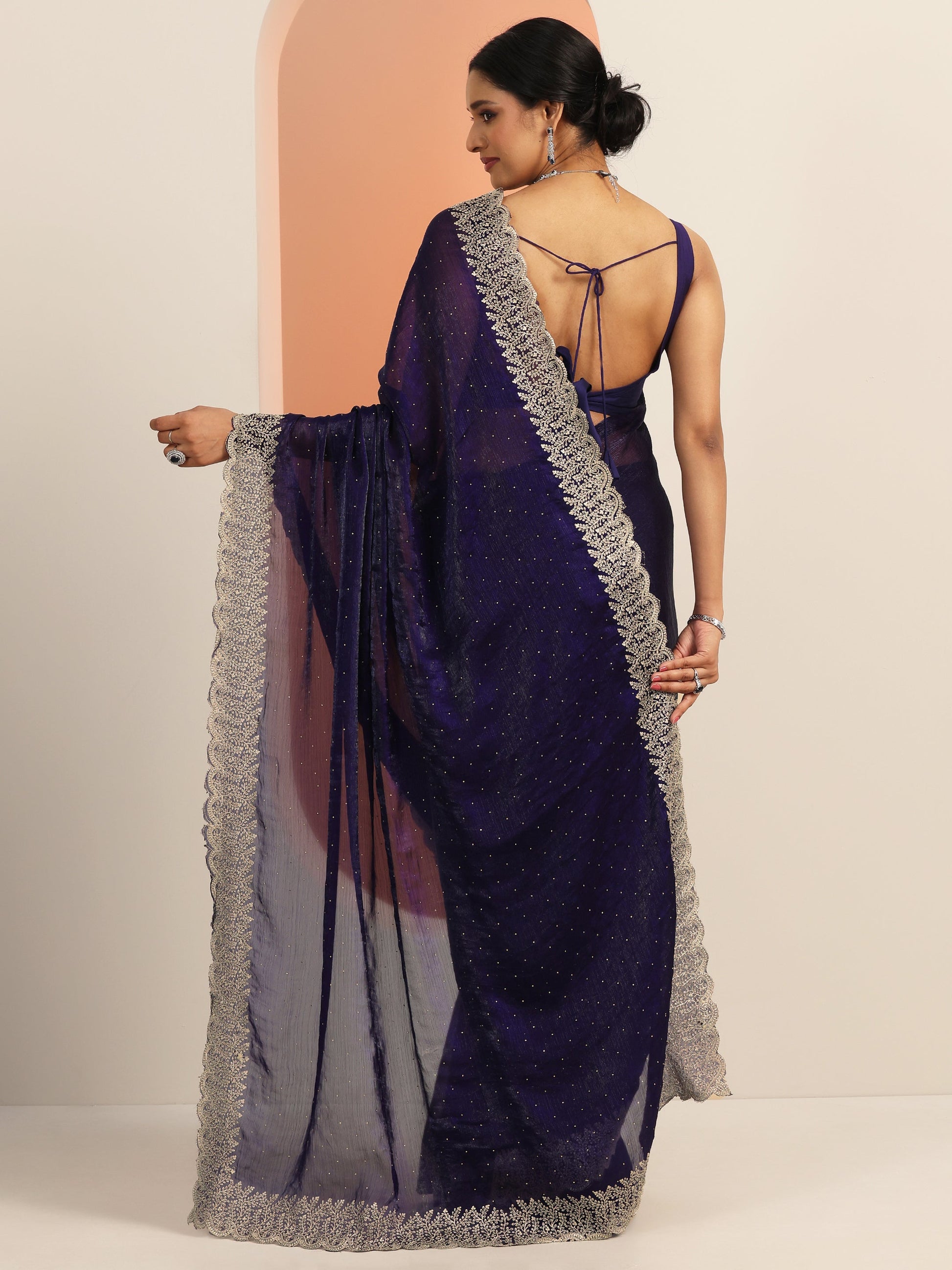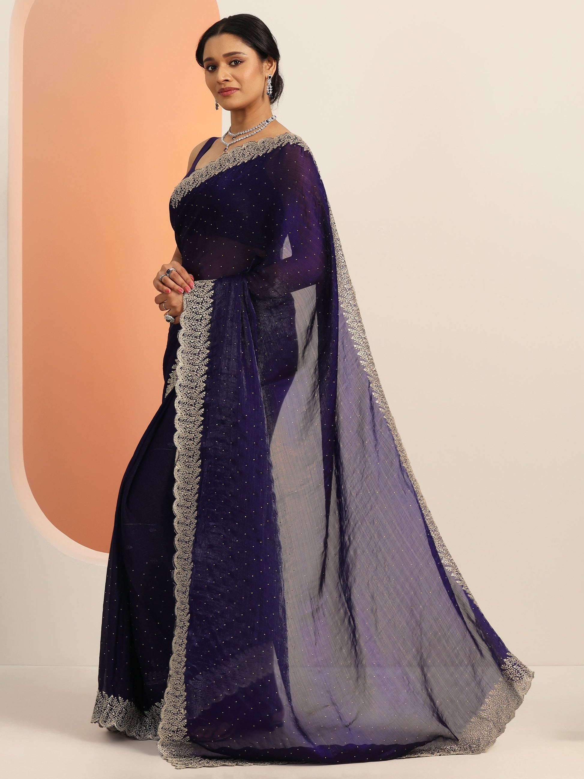 Navy blue Embellished Chiffon Saree With Unstitched Blouse Piece