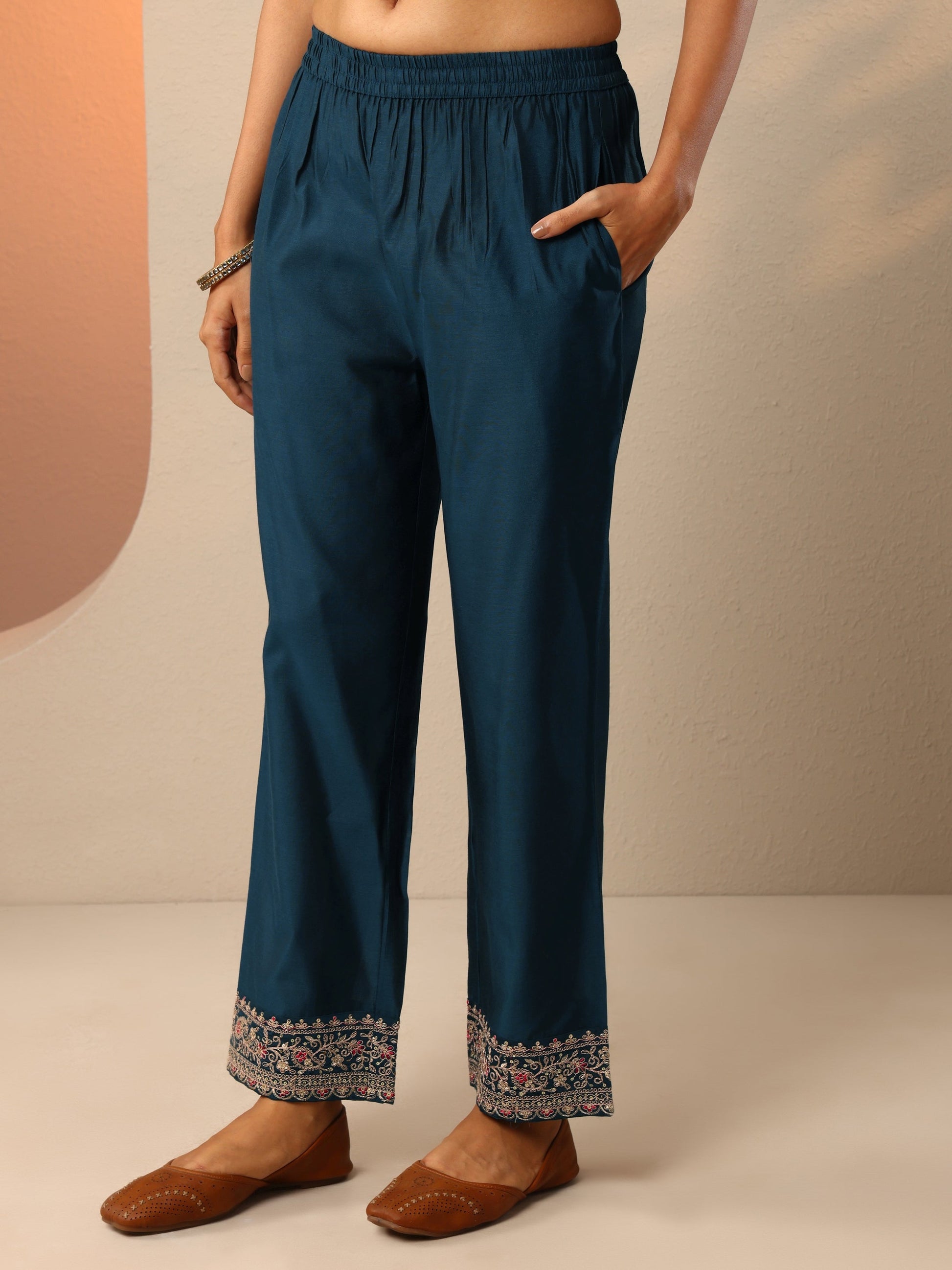 Our 3-piece Teal Silk blend Anarkali Kurta Set features a V-Neckline, Regular Sleeves, and statement Yoke. Complemented with Straight Pants with a Partially Elasticated waistband and 2 pockets, and an Embroidered dupatta. Adorned with Embroidered embellishments, this style is perfect for Dark Festive occasions.