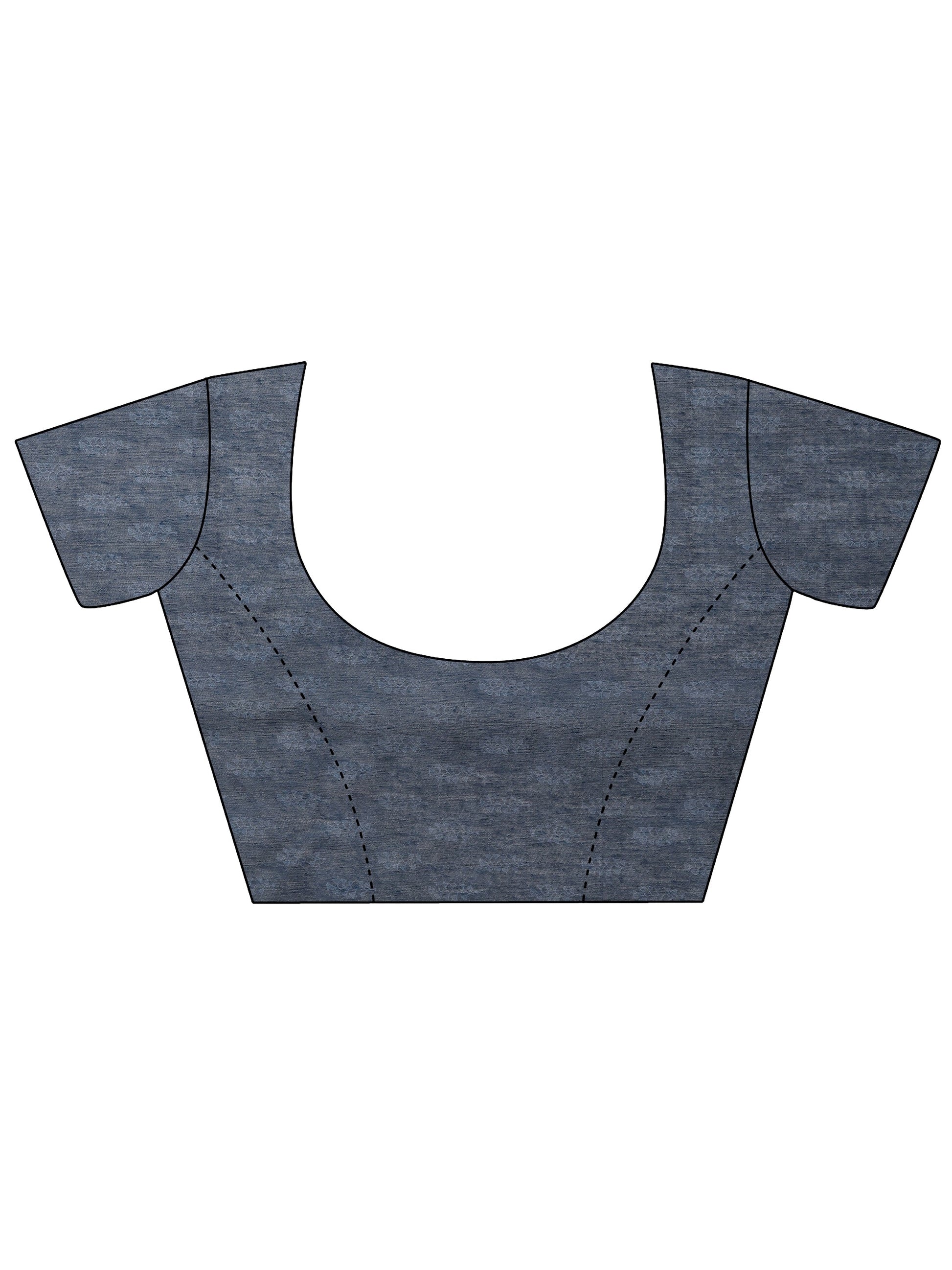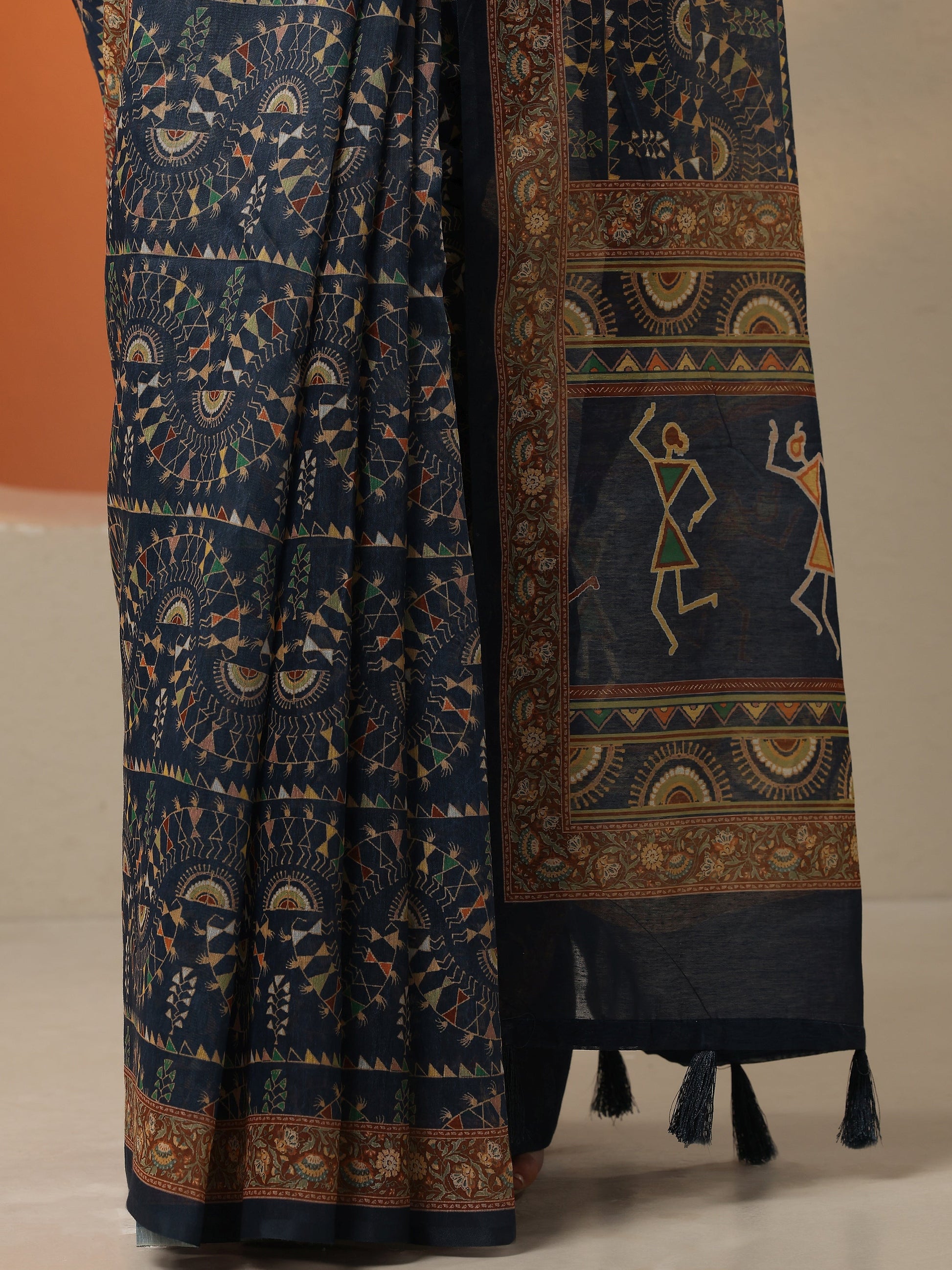 Navy Blue Printed Silk Blend Saree With Unstitched Blouse Piece