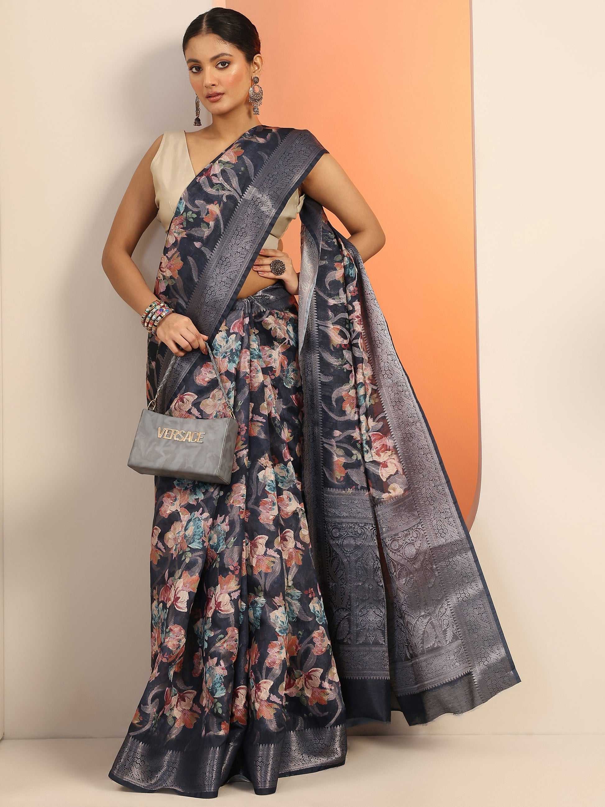 Our Navy Blue Printed Silk Blend Saree Features Captivating Floral Printed Design. Complemented With An Unstitched Blouse Piece. This Charming Saree Is Perfect For Festive Wear
