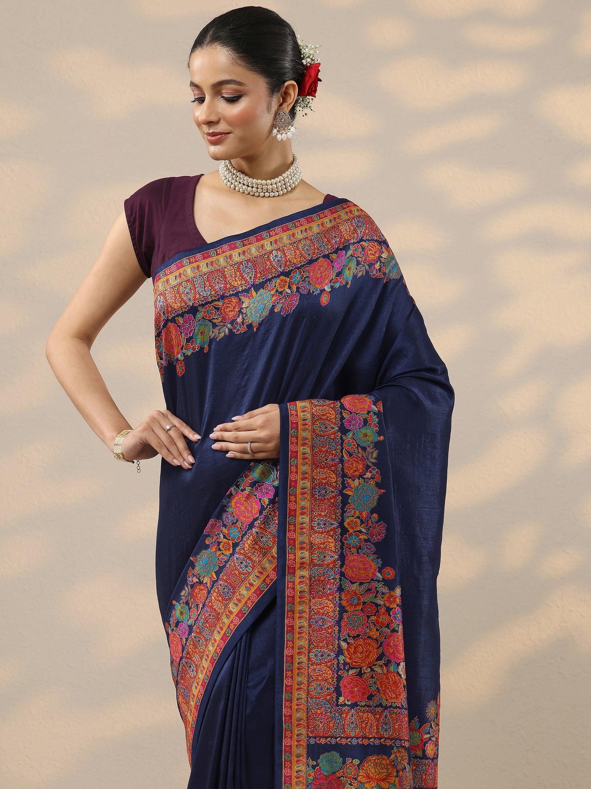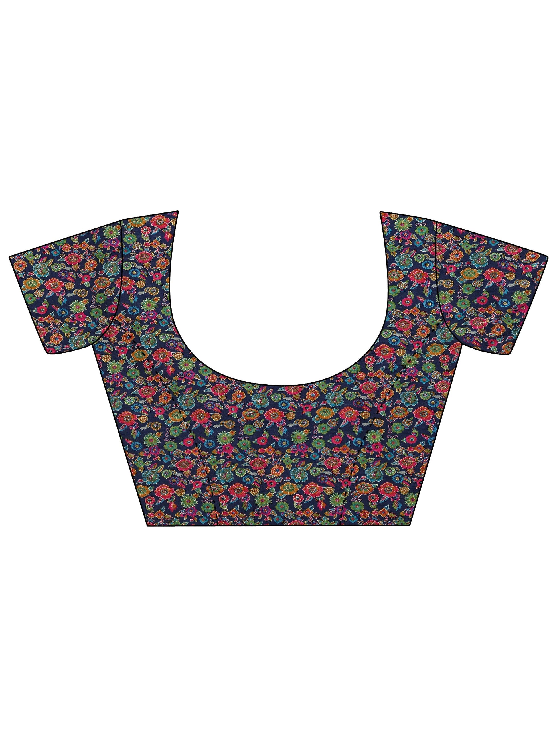 Navy Blue Printed Silk Blend Saree With Unstitched Blouse Piece