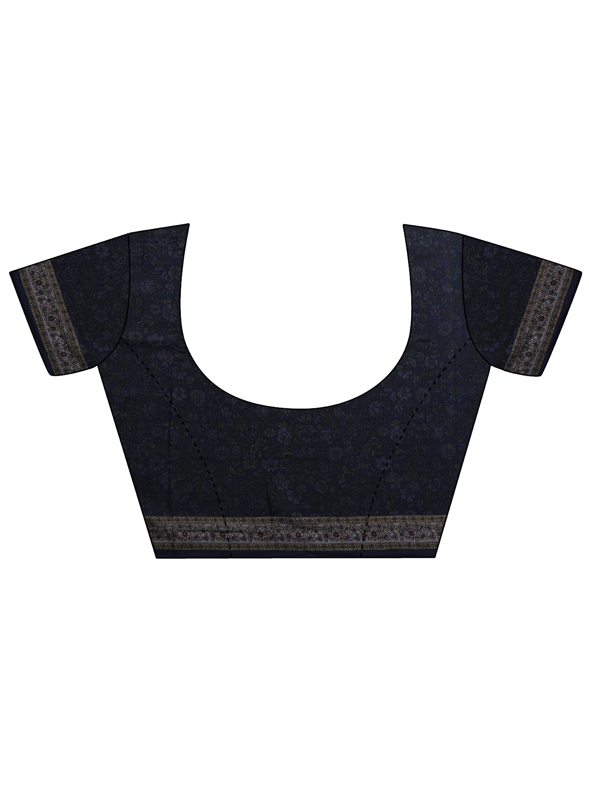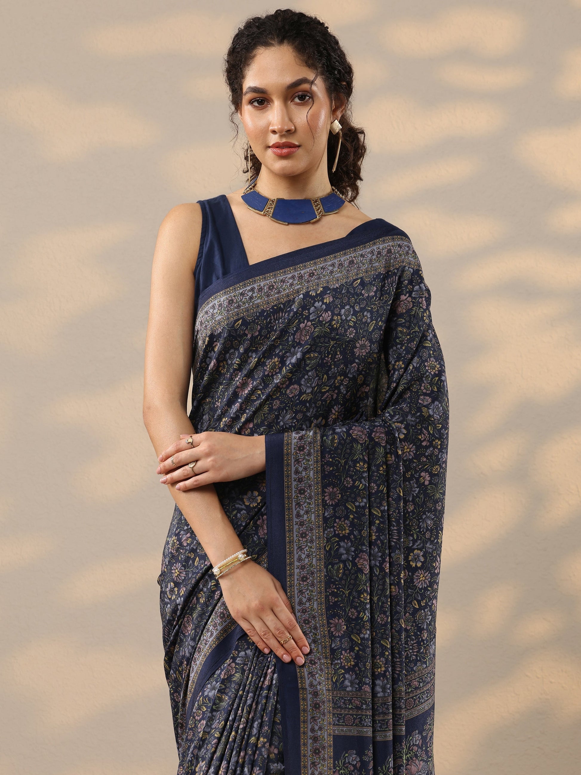 Navy Blue Printed Silk Blend Saree With Unstitched Blouse Piece