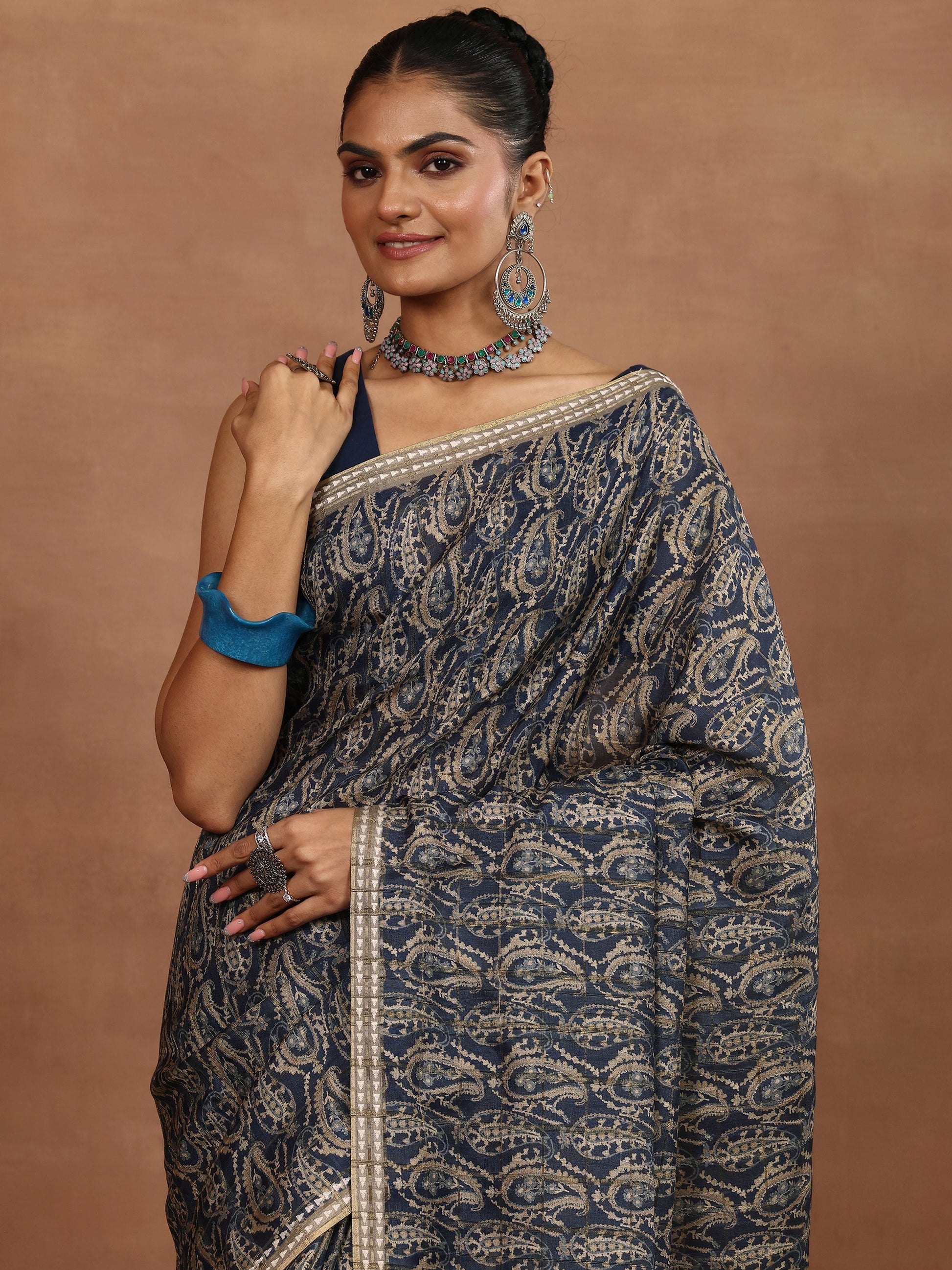 Navy Blue Printed Silk Blend Sarees With Unstitched Blouse Piece