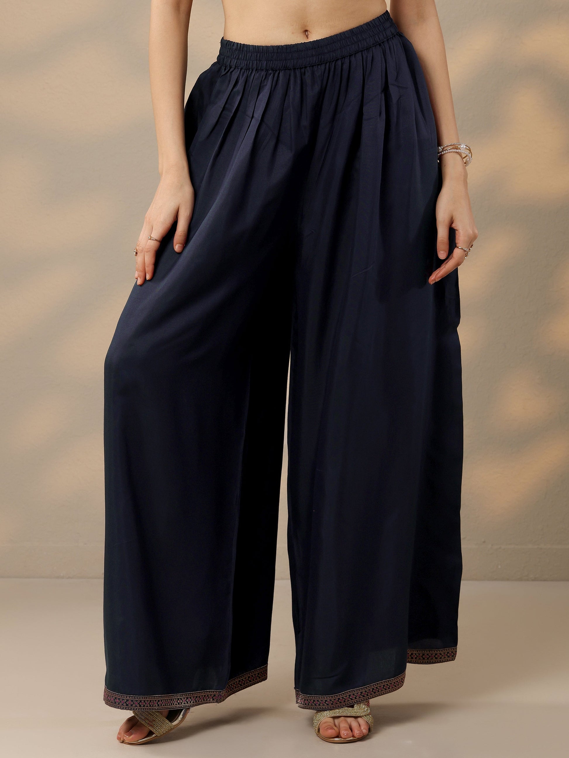 Our 3-piece Navy Blue Silk blend Kurta Set features a Sweetheart Neckline, Regular Sleeves, and statement yoke. Complemented with Palazzo Pants with a Partially Elasticated waistband and 2 pockets, and a Printed dupatta. Adorned with Embroidered accents, this style is perfect for Dark Festive occasions.