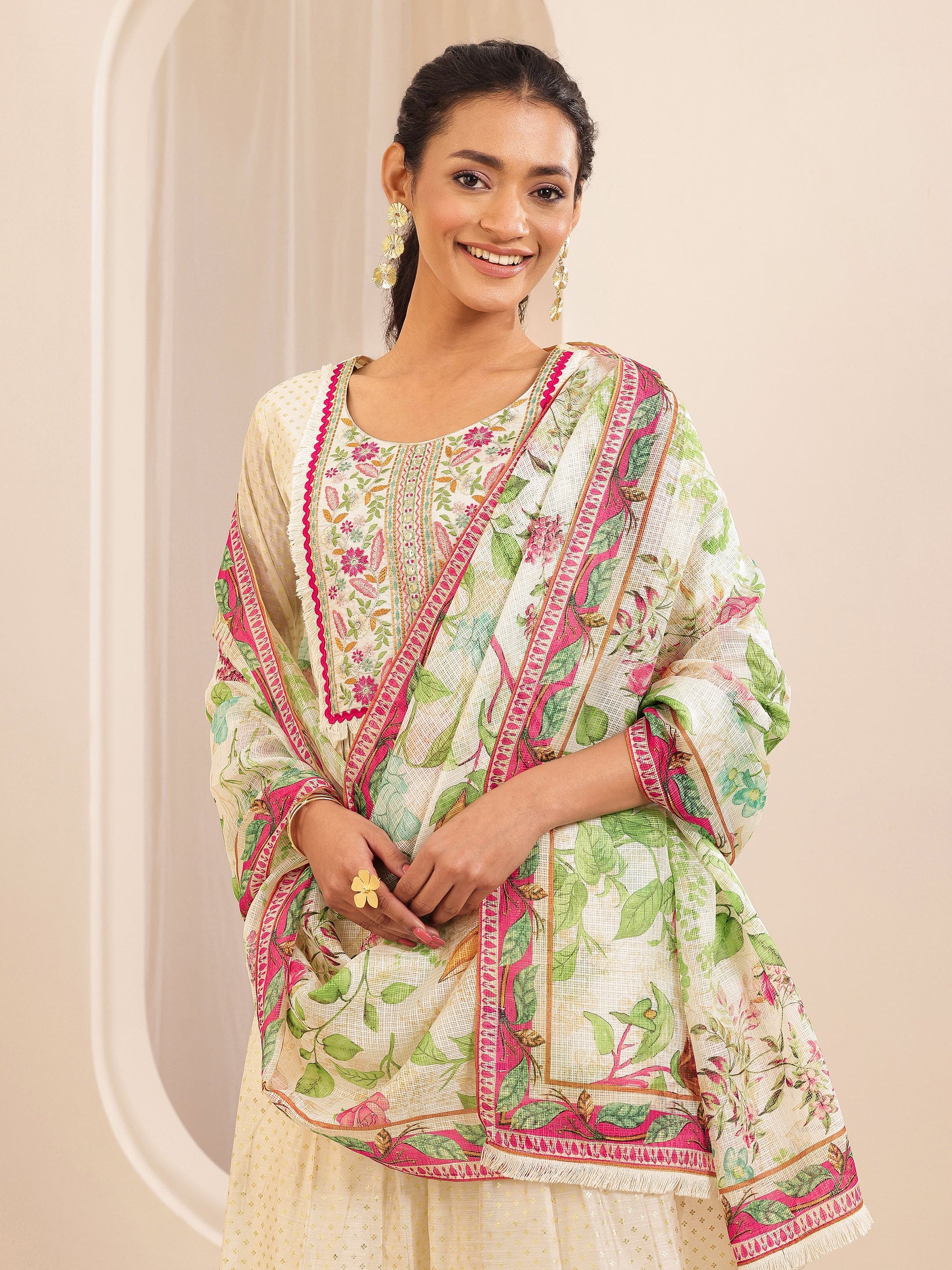 Our 3-piece multi, cream Chanderi silk kurta set features a straight-fit kurta with a round neckline, regular sleeves, and statement yoke. Complemented with straight pants with a partially elasticated waistband and a floral, printed dupatta. Adorned with floral, embroidered accents, this style is perfect for festive occasions.
