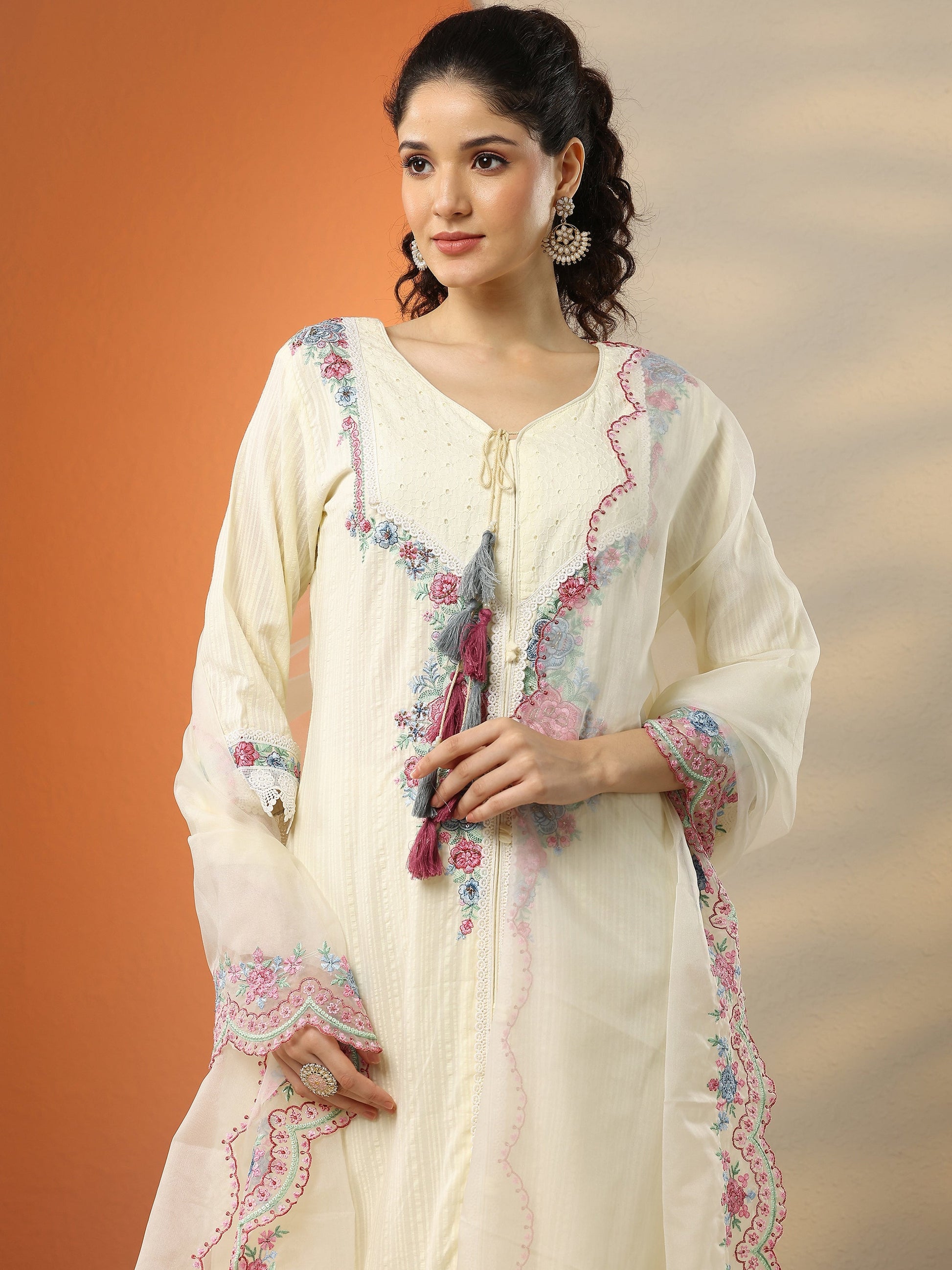 Off White Embroidered Cotton Straight Suit Set With Dupatta