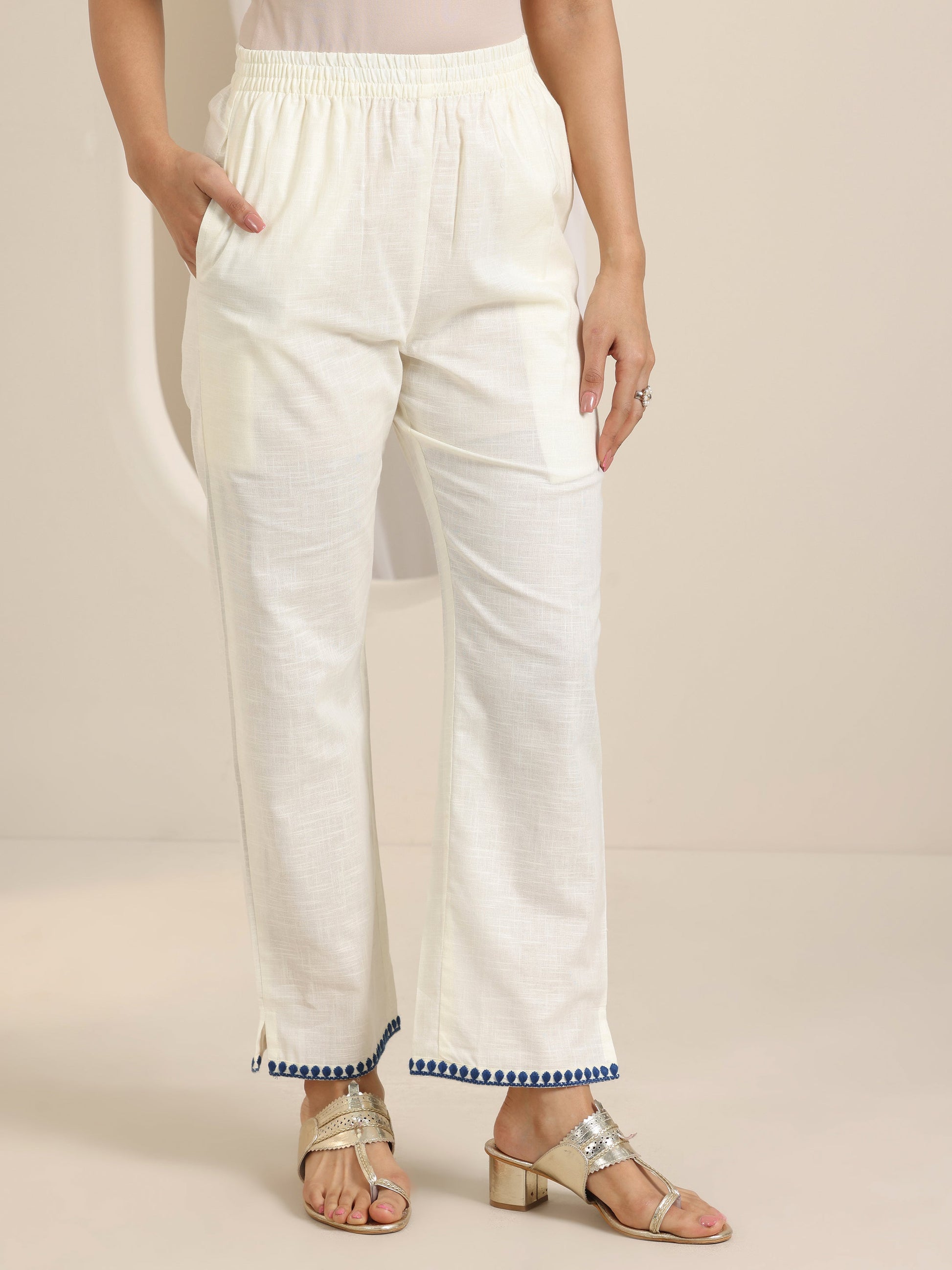 Off White Embroidered Cotton Straight Suit Set With Dupatta