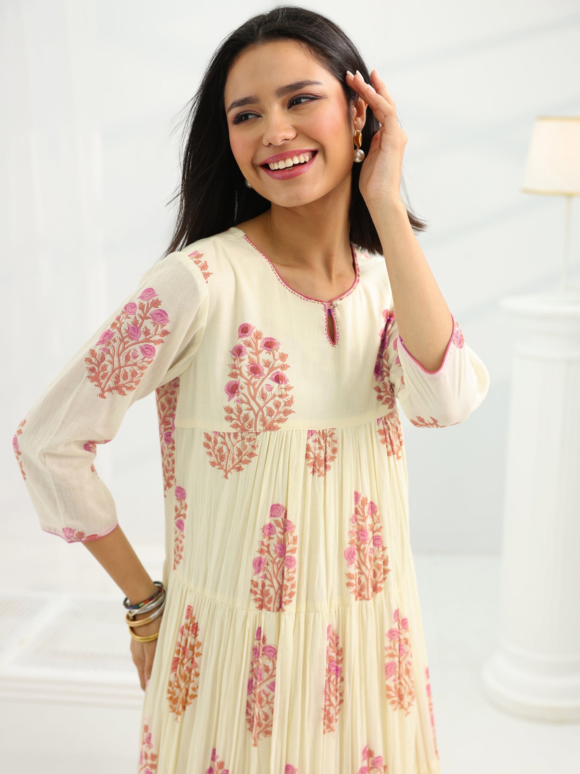 Off White Printed Cotton Pleated A-Line One Piece Dress