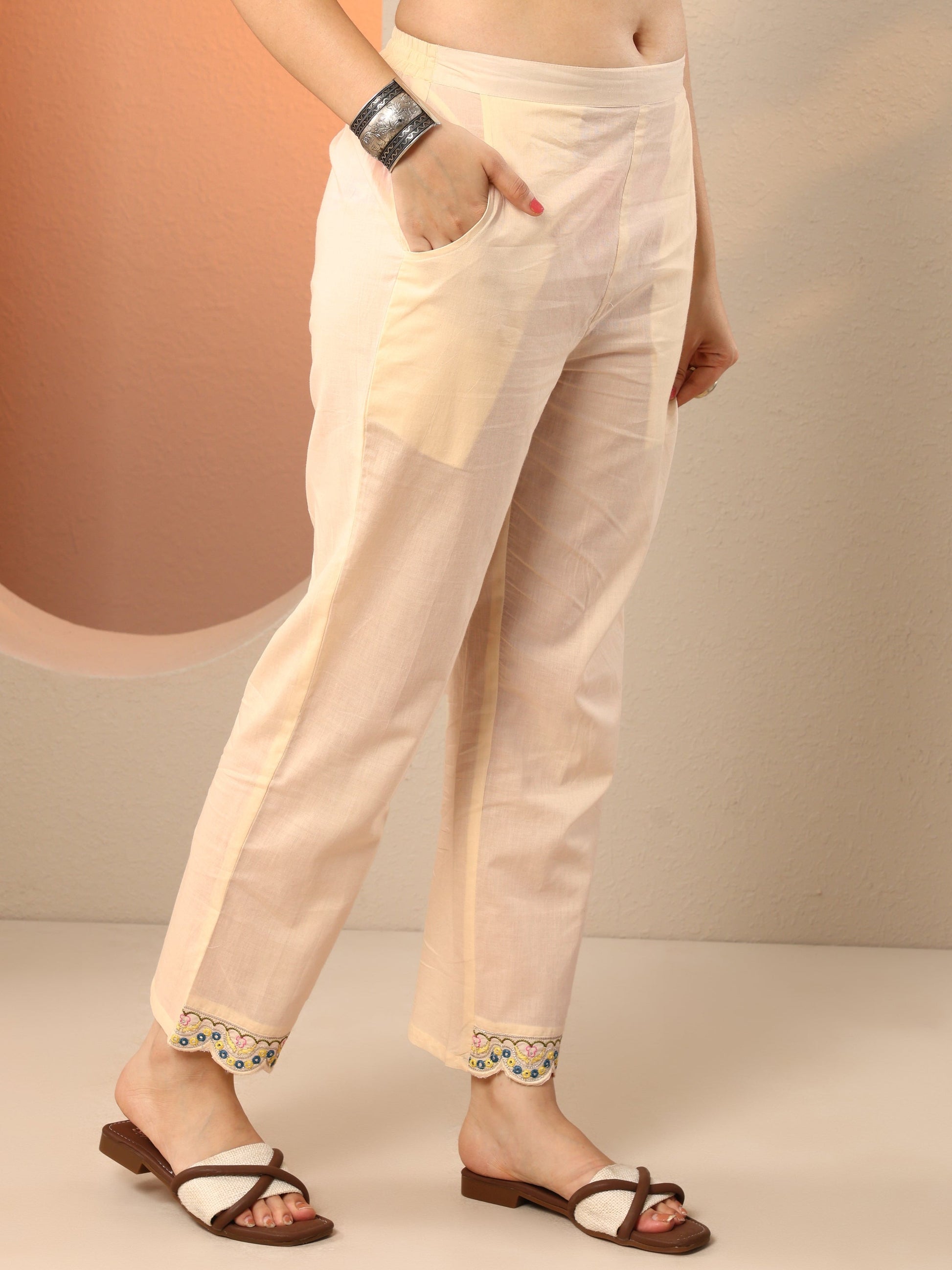 Our 3-piece cream multi cotton Anarkali kurta set features a tie-up neckline, regular sleeves, and a statement yoke. Complemented with straight pants with a partially elasticated waistband and 2 pockets, and a printed dupatta. Adorned with floral prints, this style is perfect for festive occasions.
