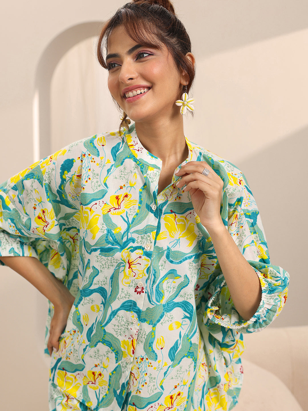 Our 2-piece multi printed cotton nightsuit features a top with a mandarin collar neckline and three-quarter sleeves. Complemented with matching pyjamas with an elasticated waistband. Elevated with printed embellishments, this style is perfect for casual wear.