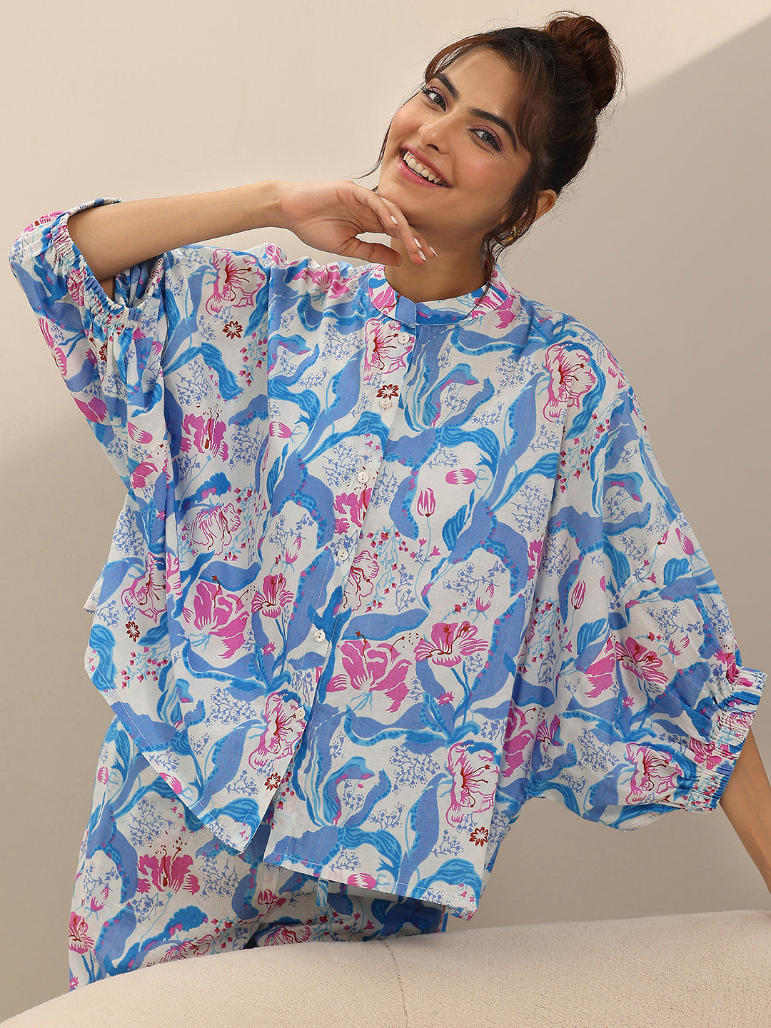 Our 2-piece blue printed cotton nightsuit features a top with a round neck neckline and three-quarter sleeves. Complemented with matching pyjamas with an elasticated waistband and 2 pockets. Elevated with printed embellishments, this style is perfect for casual wear.